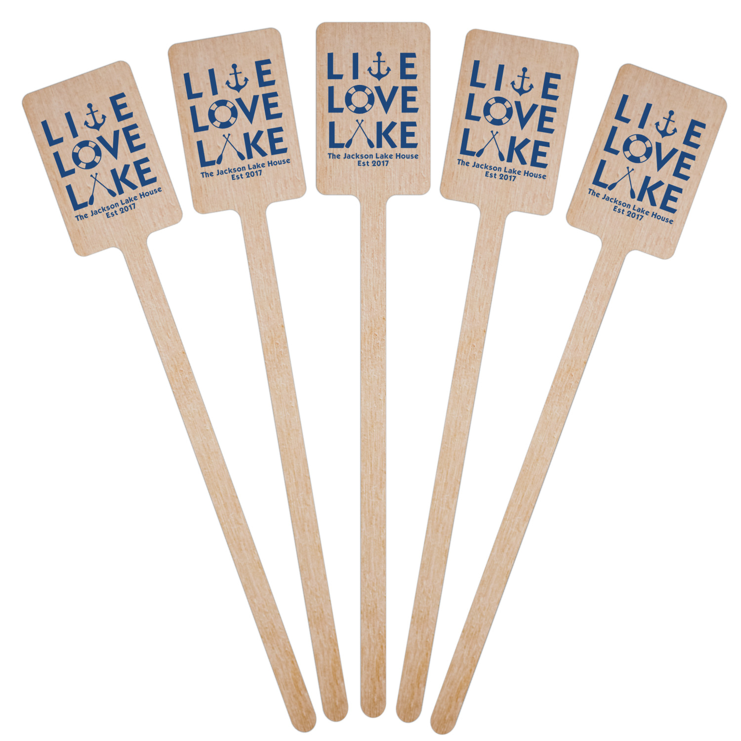 This design has a beautiful background with abstract waves that are a calming light blue. The main feature of this design is the quote. The quote used for this design says "Live Love Lake," but remember that we have many other lake house quotes to choose from. Underneath the quote you are able to put your personalization!