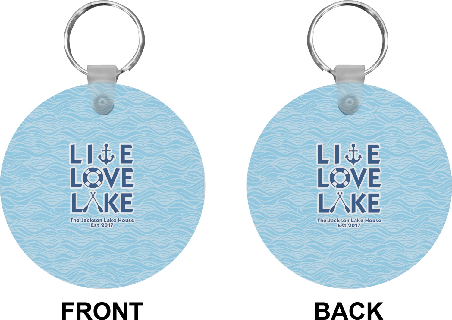 This design has a beautiful background with abstract waves that are a calming light blue. The main feature of this design is the quote. The quote used for this design says "Live Love Lake," but remember that we have many other lake house quotes to choose from. Underneath the quote you are able to put your personalization!
