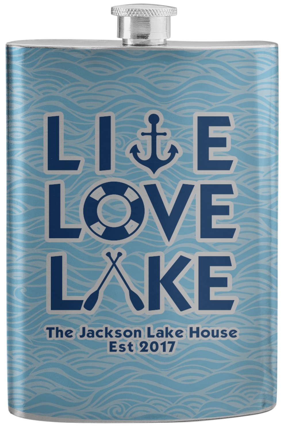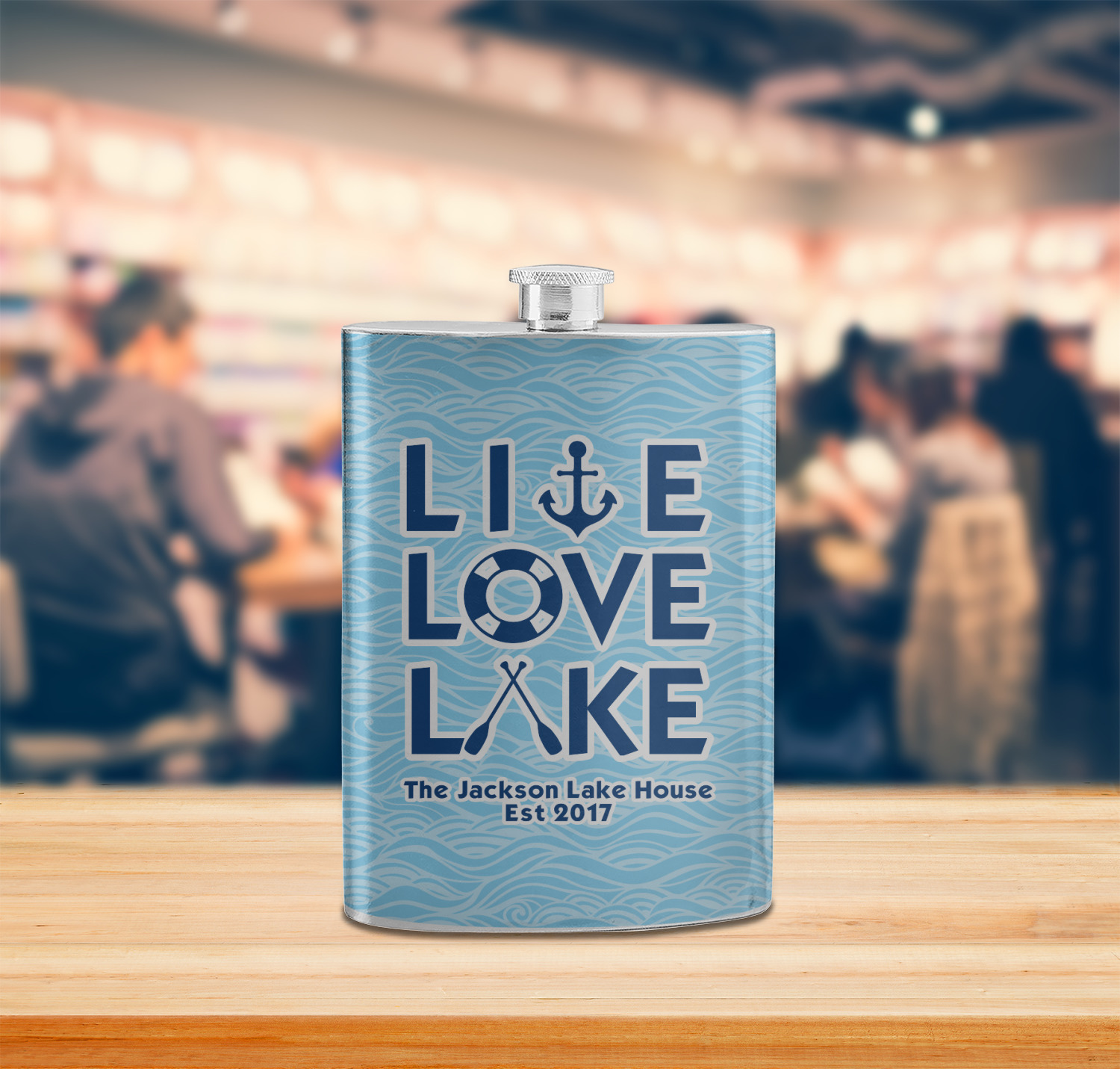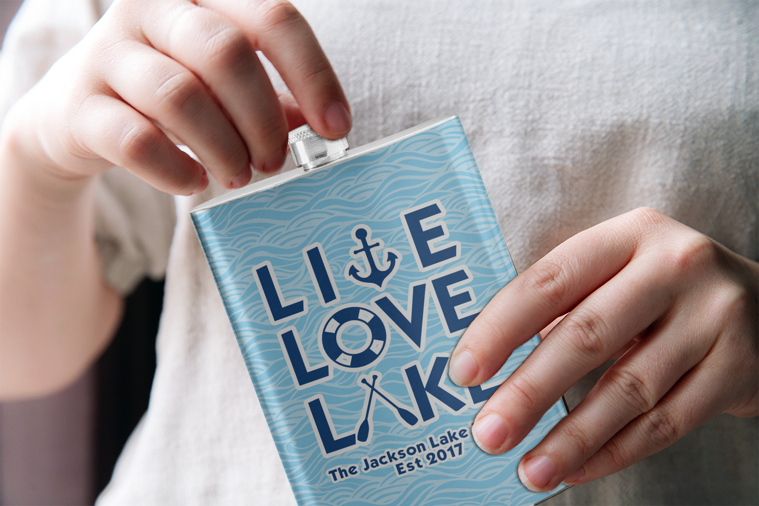 This design has a beautiful background with abstract waves that are a calming light blue. The main feature of this design is the quote. The quote used for this design says "Live Love Lake," but remember that we have many other lake house quotes to choose from. Underneath the quote you are able to put your personalization!