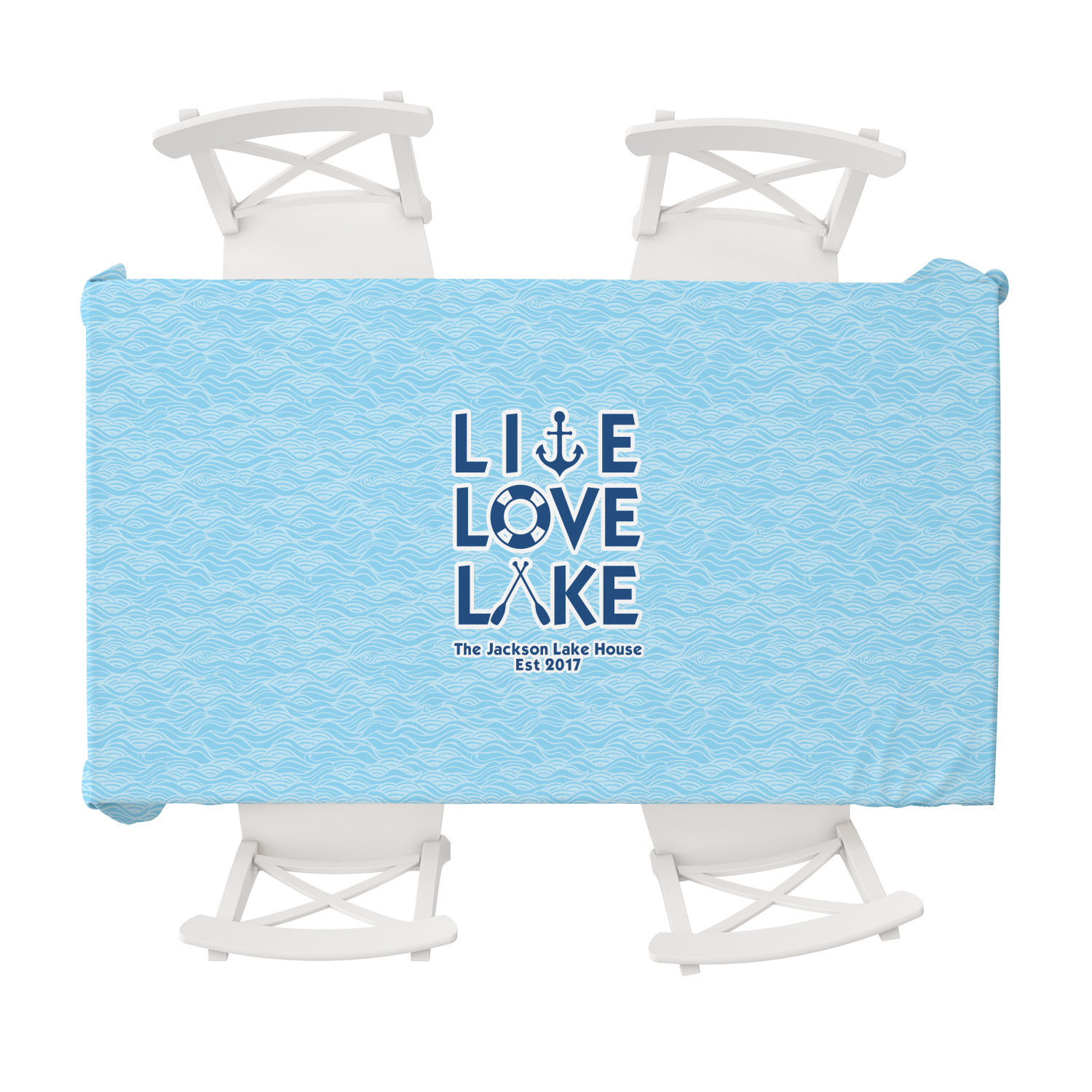 This design has a beautiful background with abstract waves that are a calming light blue. The main feature of this design is the quote. The quote used for this design says "Live Love Lake," but remember that we have many other lake house quotes to choose from. Underneath the quote you are able to put your personalization!