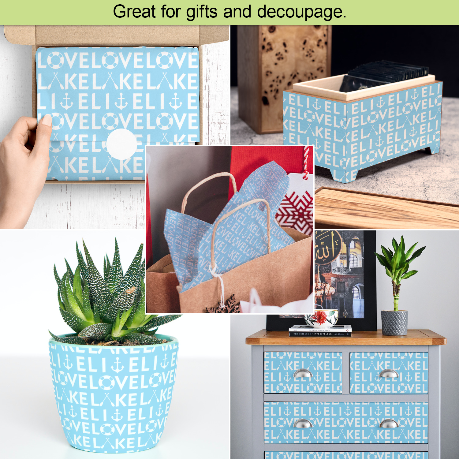 With our tissue paper sheets, you can now print whatever you want to decoupage. You don't have to figure out how to get text on top of purchased papers. You can design it all into a sheet(s) and decorate items exactly the way you want to.