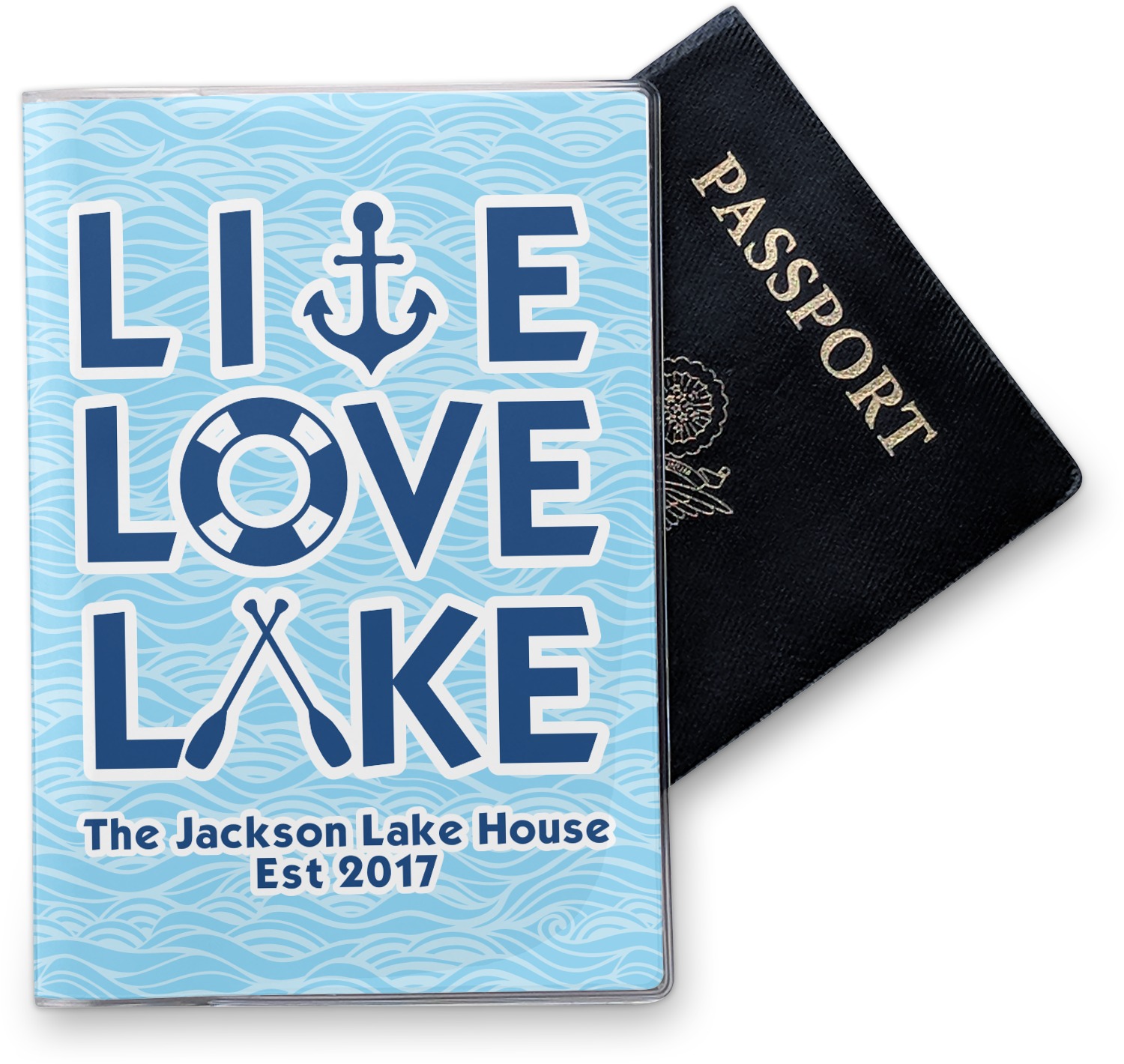 This design has a beautiful background with abstract waves that are a calming light blue. The main feature of this design is the quote. The quote used for this design says "Live Love Lake," but remember that we have many other lake house quotes to choose from. Underneath the quote you are able to put your personalization!
