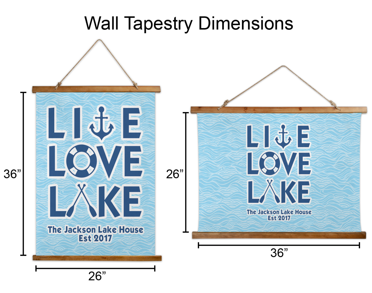 Made in two different orientations - portrait or landscape - both are 26" x 36". Your design is printed on a high quality polyester fabric with hemmed edges. The wood on the top and bottom of the tapestry is 1.25" tall and 0.25" thick and there are two pieces on top and bottom which sandwich the fabric.