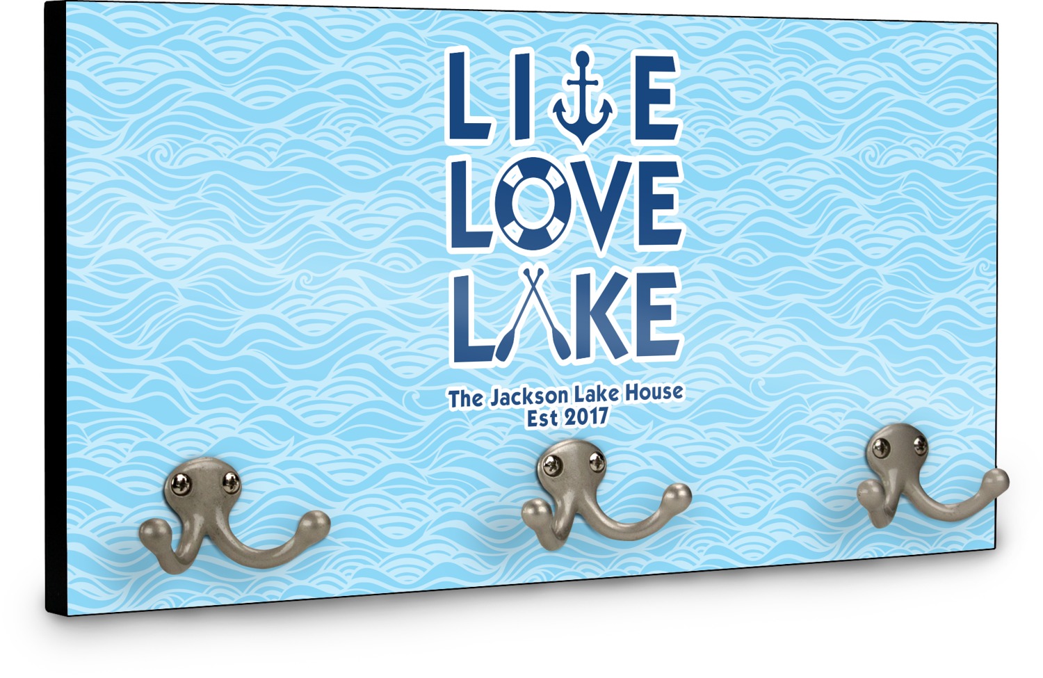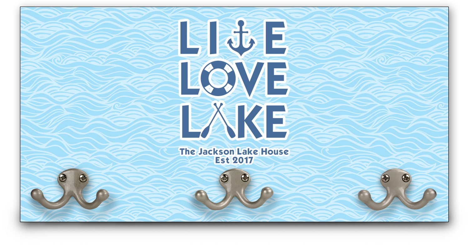 This design has a beautiful background with abstract waves that are a calming light blue. The main feature of this design is the quote. The quote used for this design says "Live Love Lake," but remember that we have many other lake house quotes to choose from. Underneath the quote you are able to put your personalization!