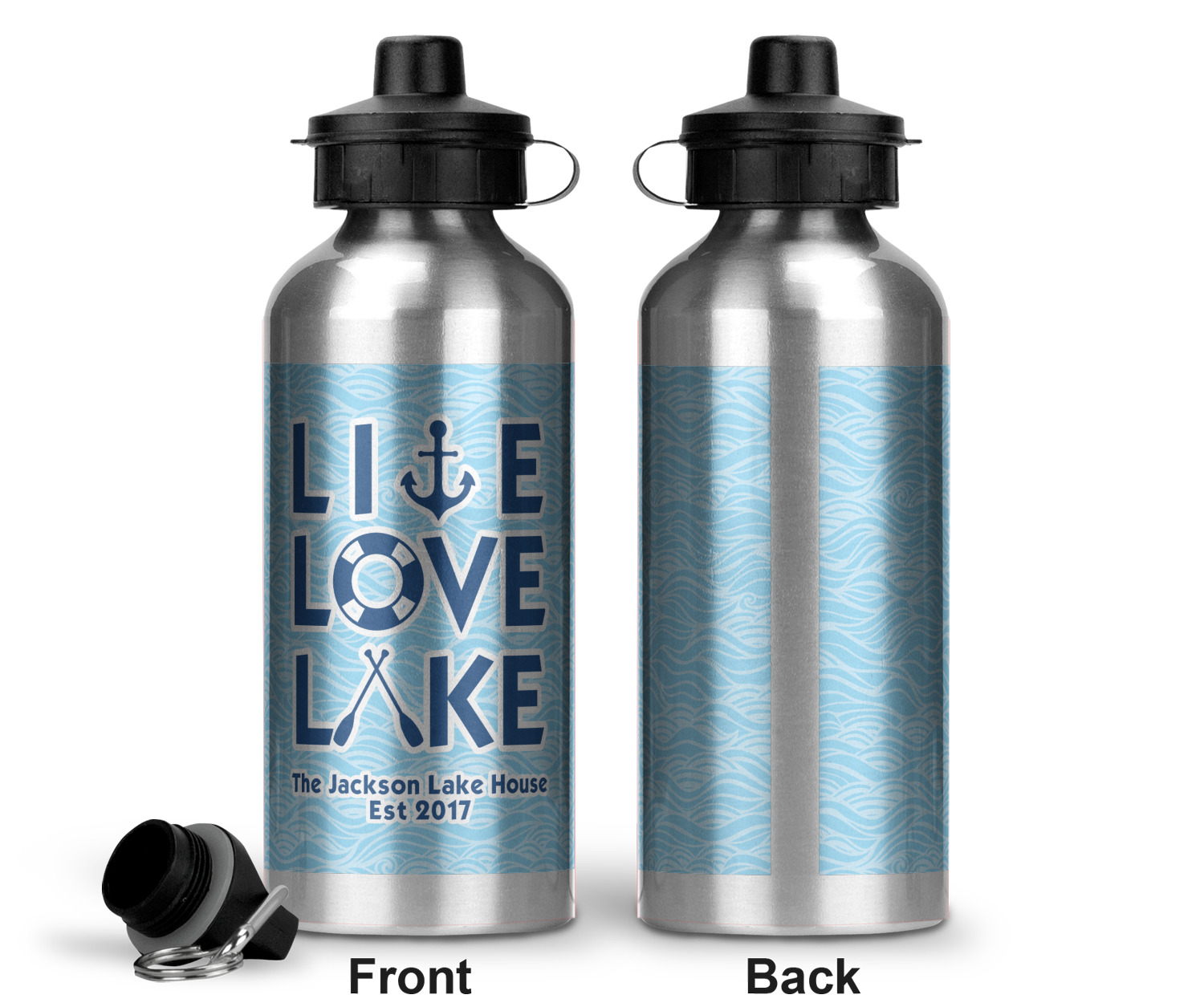 This design has a beautiful background with abstract waves that are a calming light blue. The main feature of this design is the quote. The quote used for this design says "Live Love Lake," but remember that we have many other lake house quotes to choose from. Underneath the quote you are able to put your personalization!