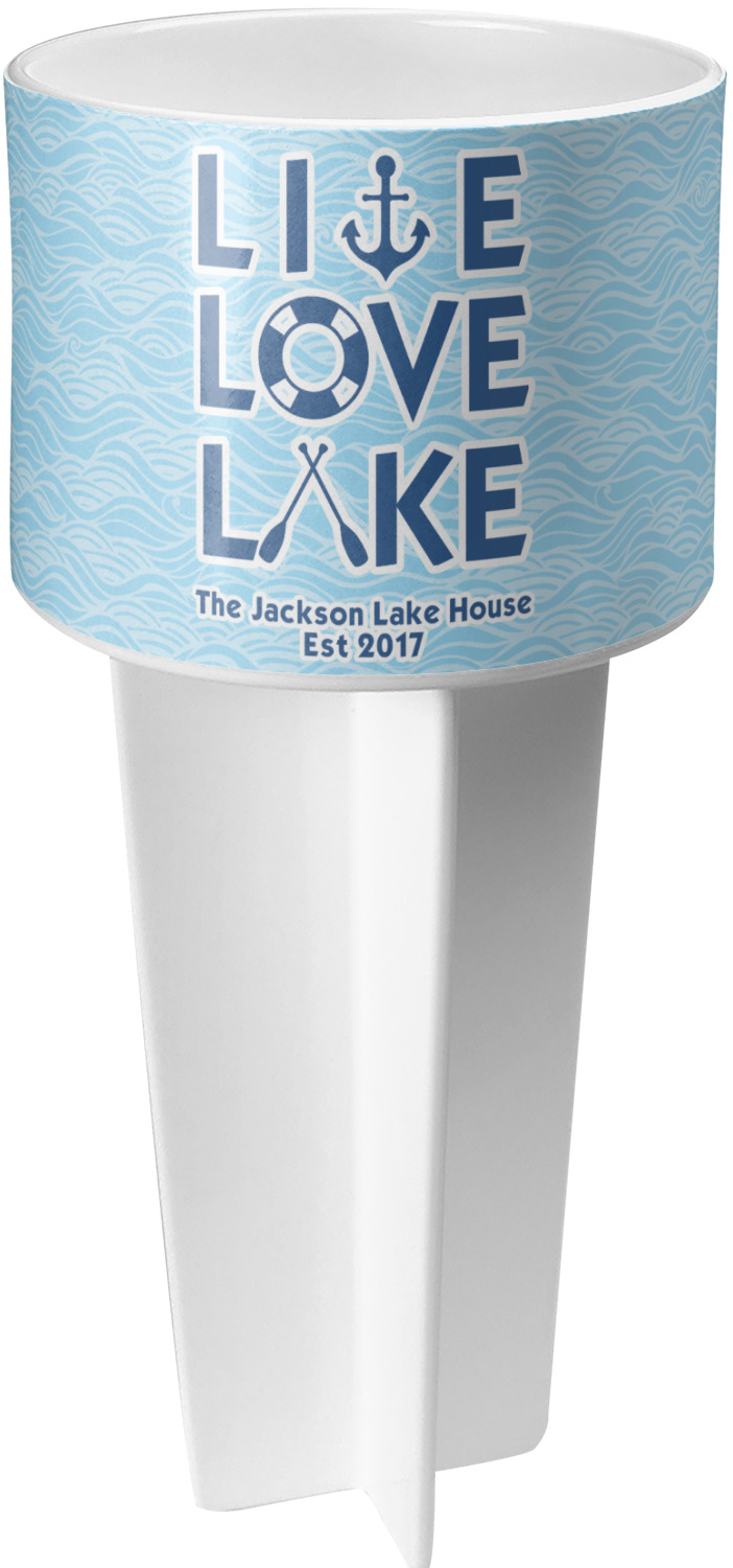 This cup holder has a large stake at its bottom that anchors it to the sand or ground below, while the cup holder rests above the stake. The entire drink holder is made of durable plastic and displays your customization around the cup holder portion. We sell these personalized beach spikers in two different colors: black and white.