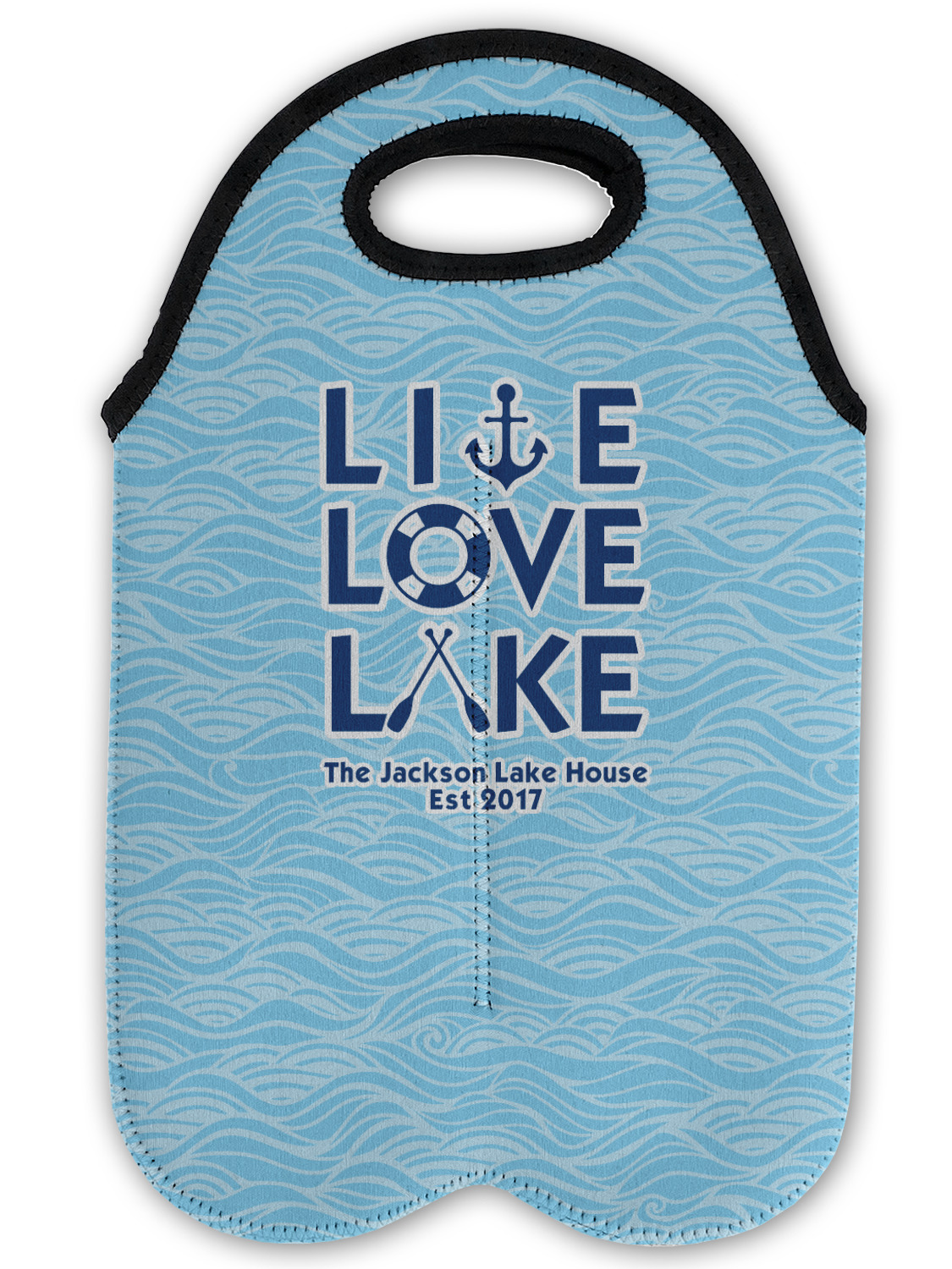 This design has a beautiful background with abstract waves that are a calming light blue. The main feature of this design is the quote. The quote used for this design says "Live Love Lake," but remember that we have many other lake house quotes to choose from. Underneath the quote you are able to put your personalization!