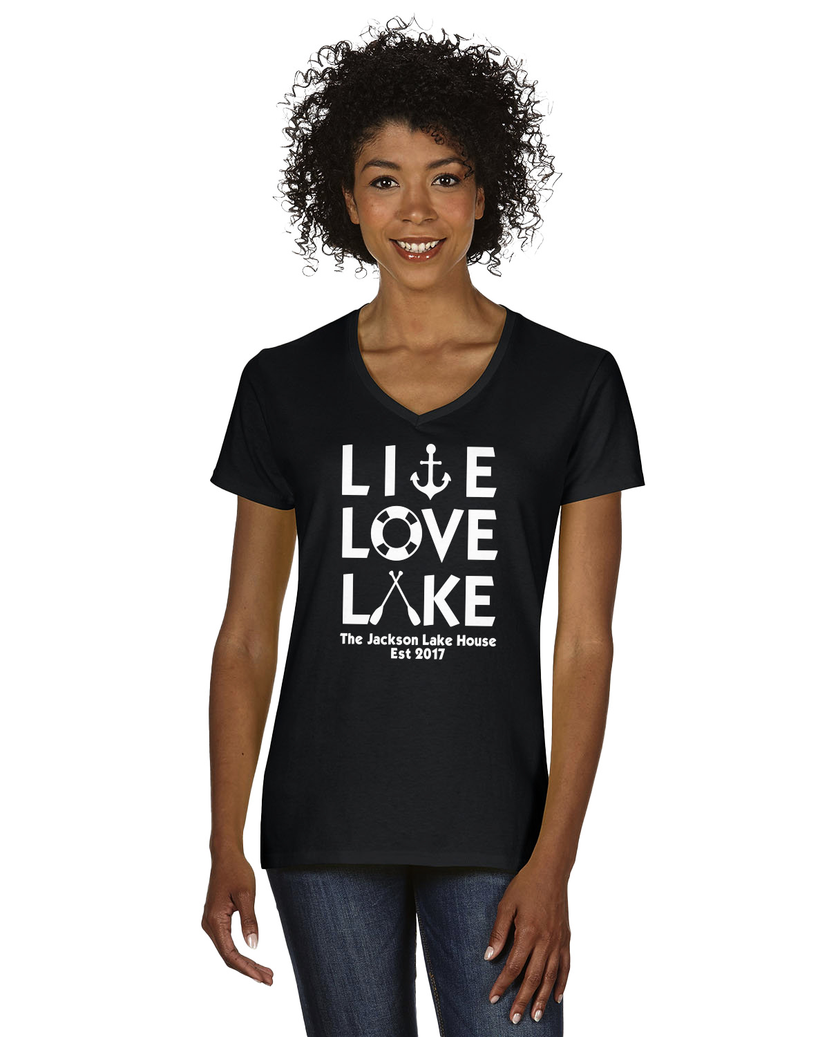 This design has a beautiful background with abstract waves that are a calming light blue. The main feature of this design is the quote. The quote used for this design says "Live Love Lake," but remember that we have many other lake house quotes to choose from. Underneath the quote you are able to put your personalization!