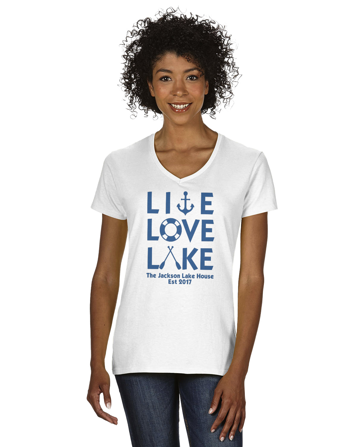 This design has a beautiful background with abstract waves that are a calming light blue. The main feature of this design is the quote. The quote used for this design says "Live Love Lake," but remember that we have many other lake house quotes to choose from. Underneath the quote you are able to put your personalization!