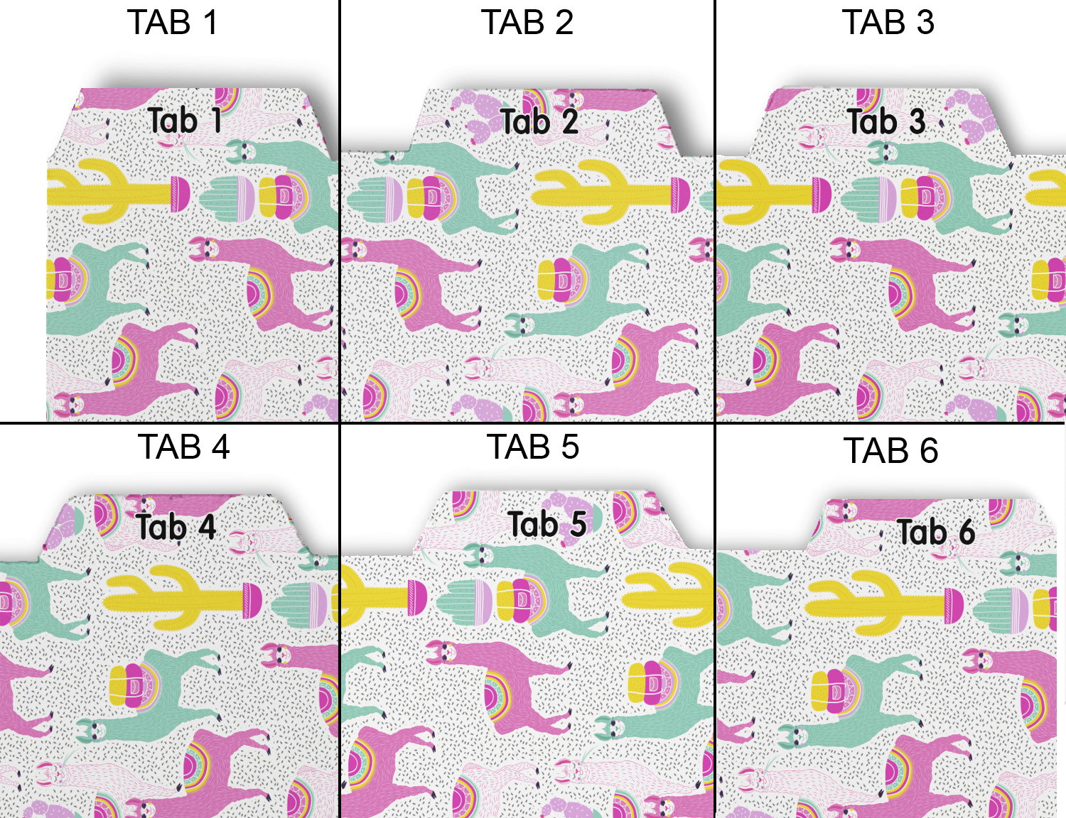 Whether you use binders at school or at work, we have designs to suit all of them. Available in 5 or 6 tab sets, you are sure to find a set to suit your needs. The back of each one is white and can be used to take notes, write vital information on, etc.