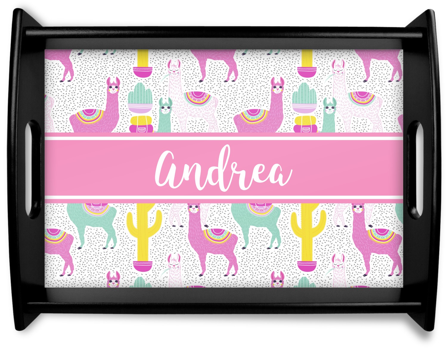 This serving tray with handles features square edges and two rounded sides, creating a very modern look. Each side is fabricated from a beautifully cut, natural wood. The bottom of the interior of the tray displays your customized design in bright, vibrant color. The tray is sold in both a black color and a natural wood look. Each variation of the wood serving tray has two sizes: Small, which is 14" x 10" x 2.25", and Large, which is 19.5" x 13.5" x 2.75".
