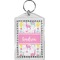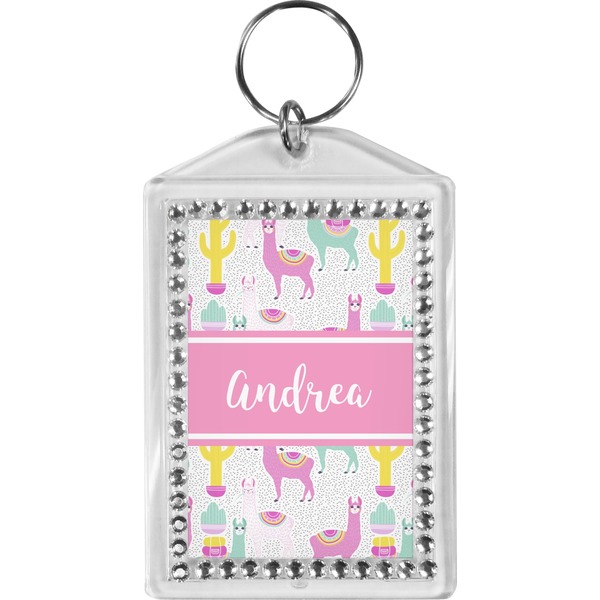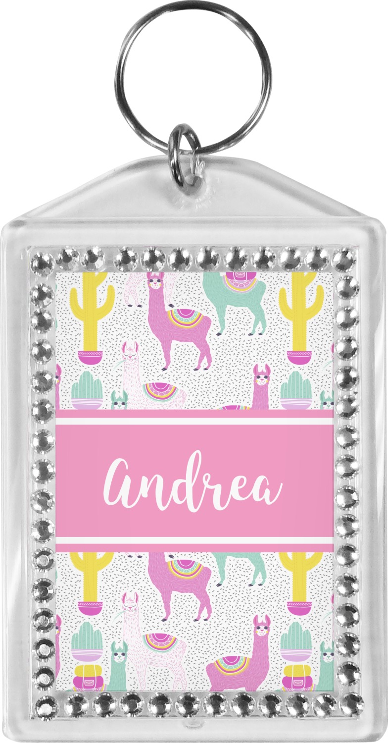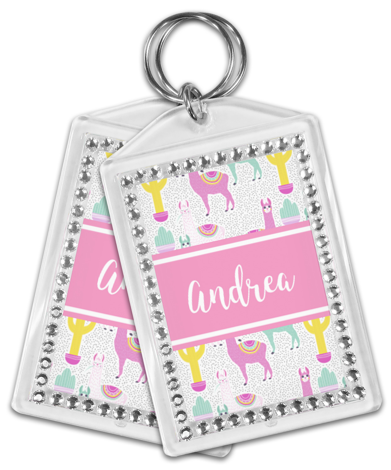 Our personalized keychains have a bold, rectangular shape, outlined by a series of shimmering rhinestones. A metal, split keyring is included with your purchase, and an additional metal hoop allows for attachment of the keychain to the split ring. This unique keychain measures at about 3.75 by 2.5 inches. We print your customized design(s) across both the back and front of this keychain.