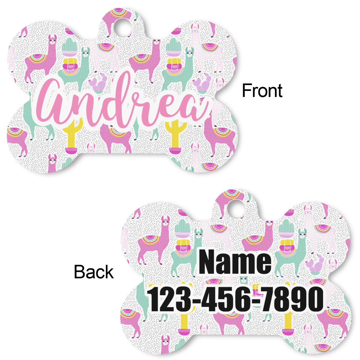 Our default design templates print your dog's personalization on the front and your contact information on the back; however everything is customizable, so you customize the patterns, the colors, the personalization, the contact information etc.