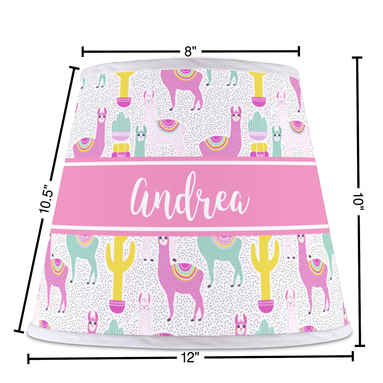The base of this lampshade is 12 inches in diameter, and the top spans 8 inches in diameter. The total height of the lampshade is 10 inches. The angled nature of this custom lampshade concentrates the light, making it ideal for smaller spaces. This lampshade is made of matte, polyfilm, and displays your customization in its middle. The top and bottom of this colorful lamp shade are lined with a white fabric ribbon (which can be replaced with black inside the design studio) which frames your design and creates a sophisticated finish. As an UNO fitter lampshade, this unique lamp shade will fit a variety of bases.