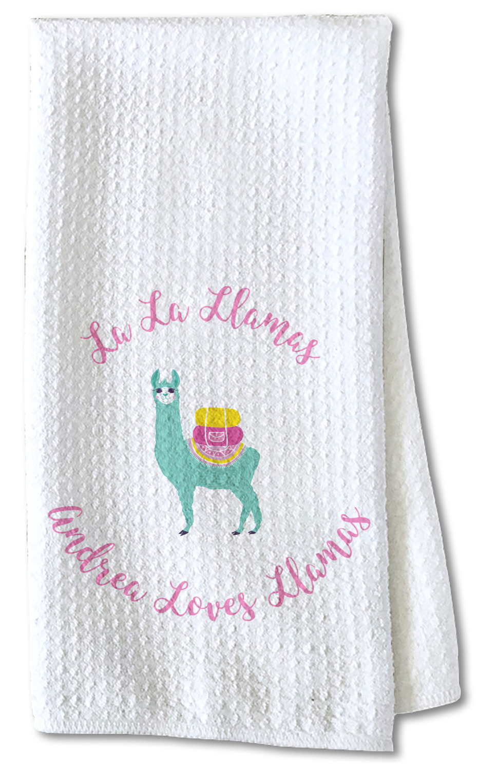Each waffle weave kitchen towel is approximately 16 x 24 inches with your design printed on one side and the back is white.