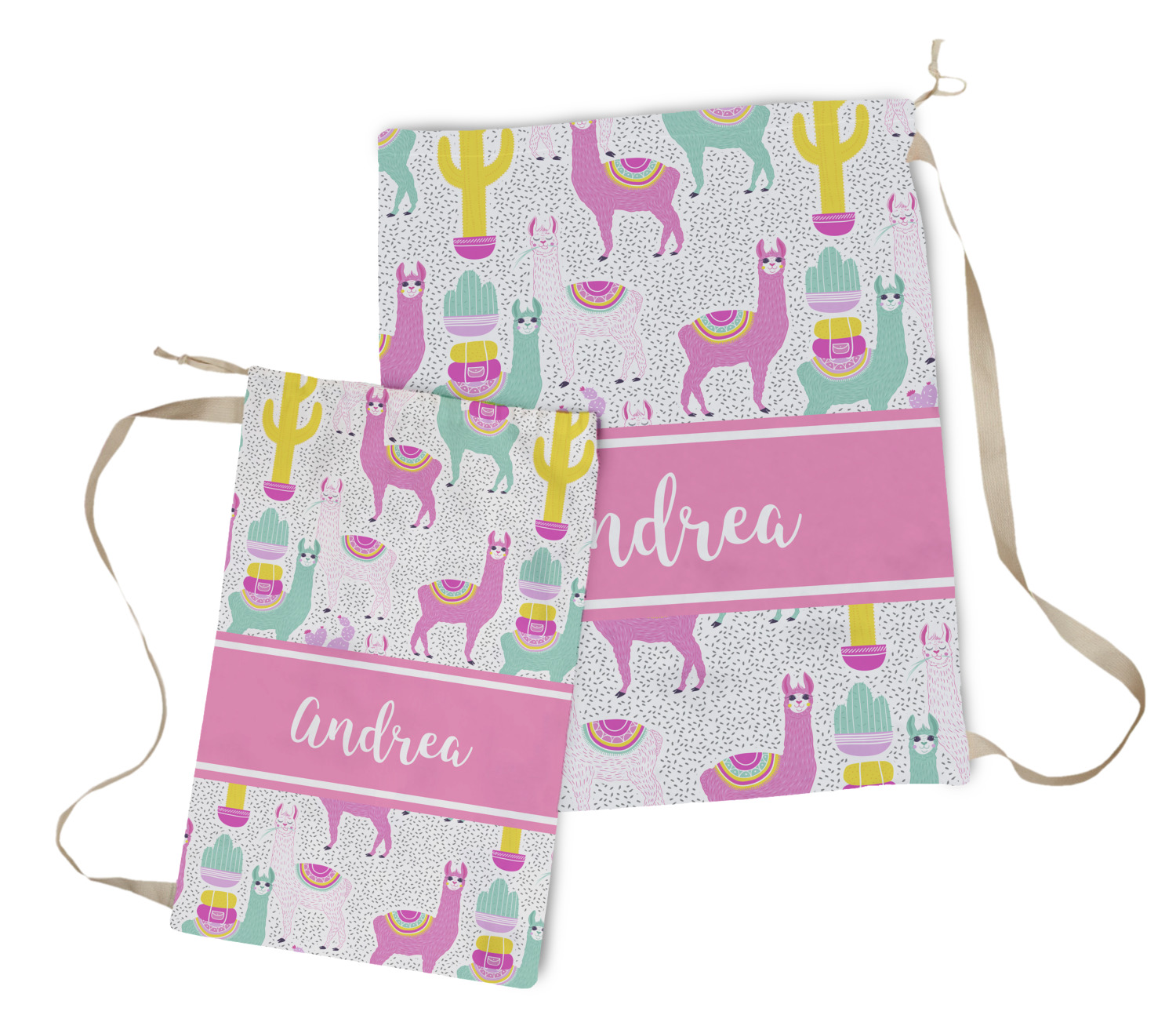 Carry your laundry in style with these customized laundry bags. Available in two sizes, featuring a natural colored woven strap and a cinch cord, these bags hold a lot of clothes or anything else you want to fit in them.