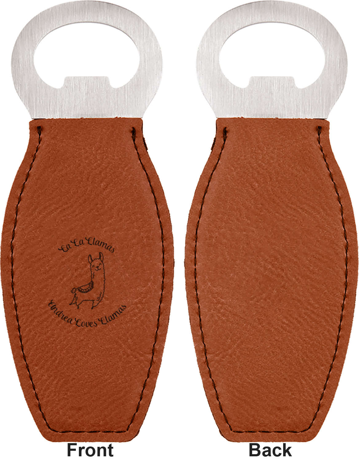 Built from stainless steel, these custom bottle openers are wrapped in a cognac-colored leatherette. Sharp, black stitching lines the edges for extra durability and a finished touch. Your personalization is laser-engraved onto the surface of this leatherette, leaving behind a crisp, black coloration. At 4.6 by 1.8 inches, this beer bottle opener gives you much of leverage when trying to open a stubborn bottle. On the opposite end of the opener, you'll find a magnet that you can use to display your new, unique bottle opener!