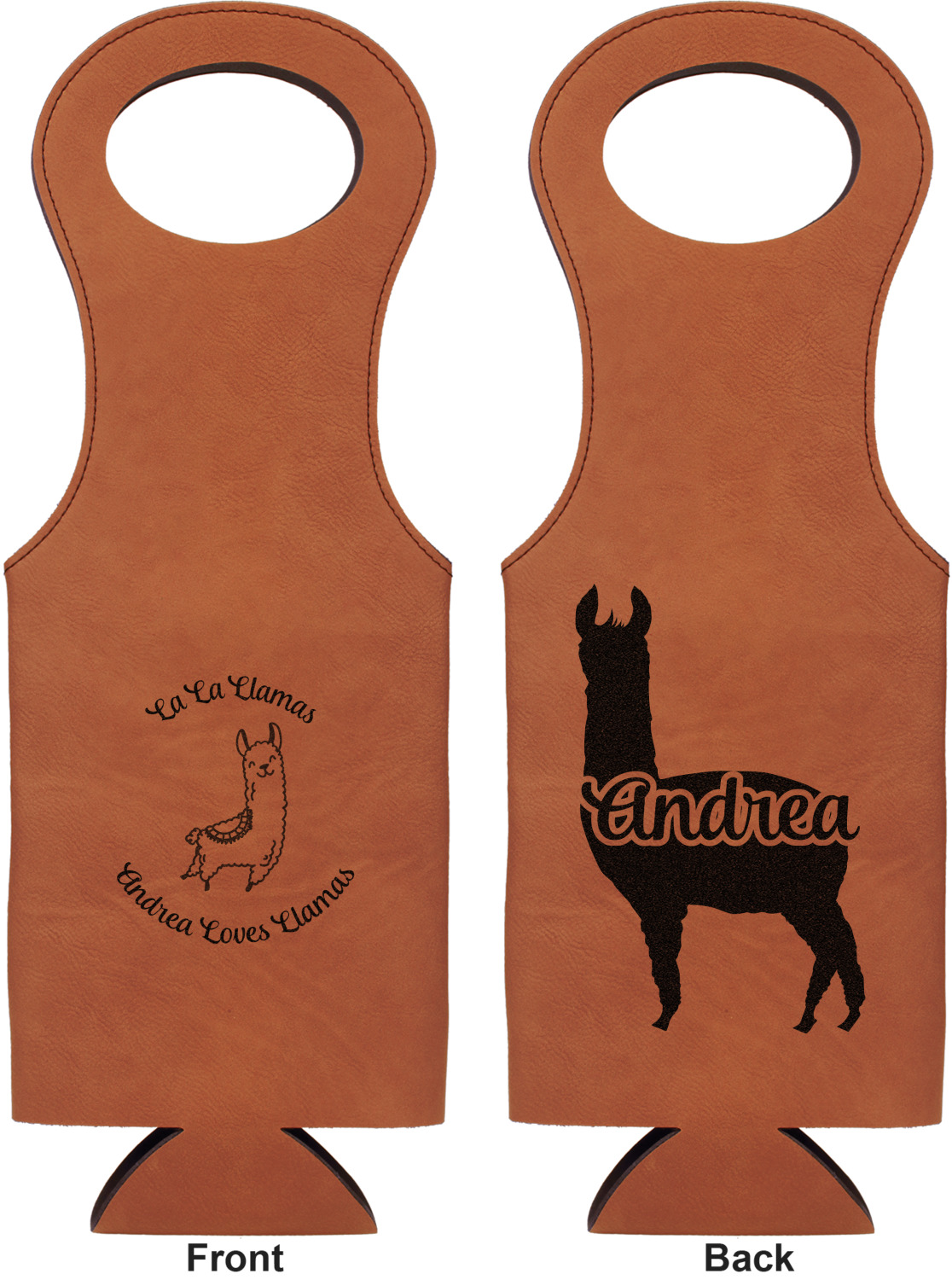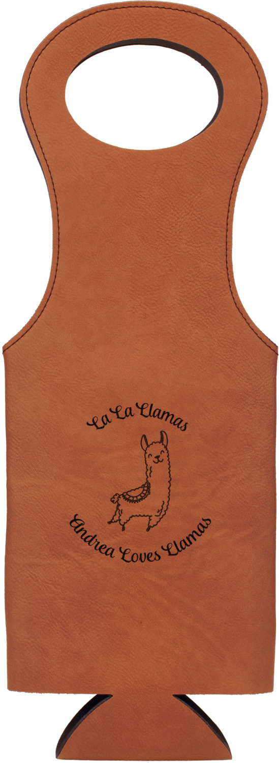 This wine carrier is made from a stunning leatherette, in a cognac-brown color. Strong, black stitching lines the sides of your wine bottle bag and provides extra durability. The interior is lined with a padded, black material to allow for a snug fit once your bottle is placed inside. At the top of this wine gift bag, you'll find two oval shaped handles that elegantly complements the rest of the bag's style. We provide you with the option of laser-engraving the front, or the front and back of your new personalized wine bag!