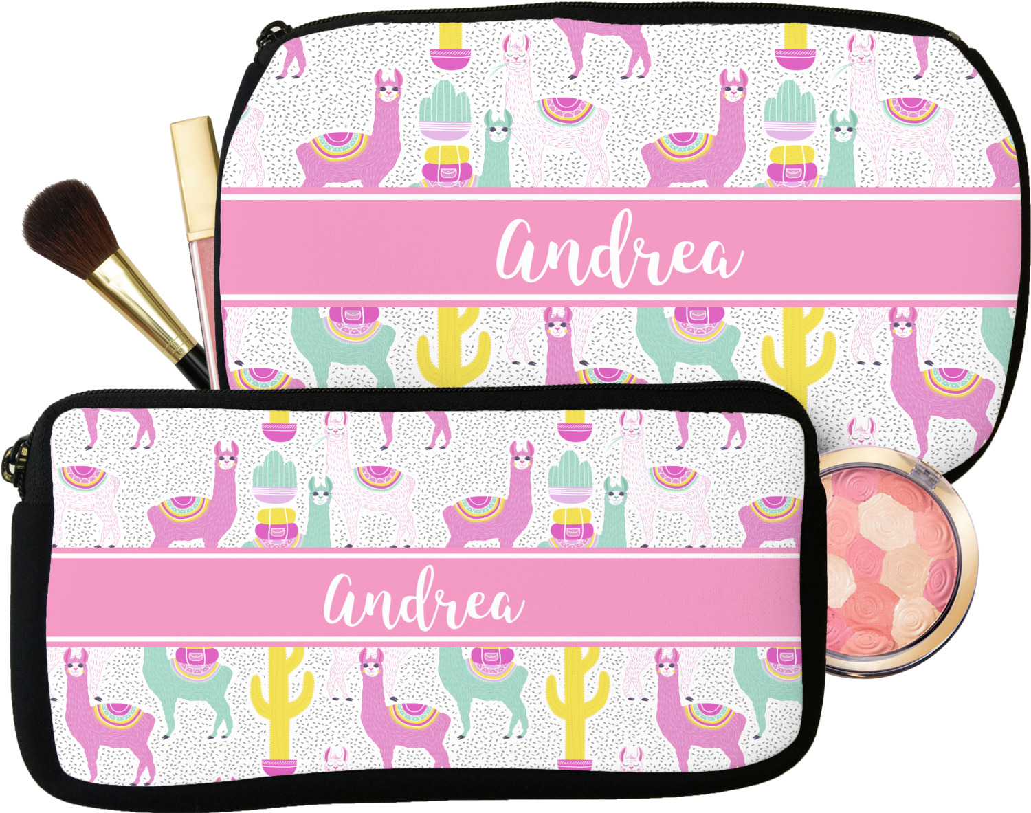Our personalized makeup bags are available in many different designs, patterns and colors - so you are sure to find one that will love. They are made of neoprene (same material as wet-suits) and thus are water resistant, so spillages in your makeup bag will not end up all over you purse. They are customized on one side and are black on the other side and the zipper is black as well.