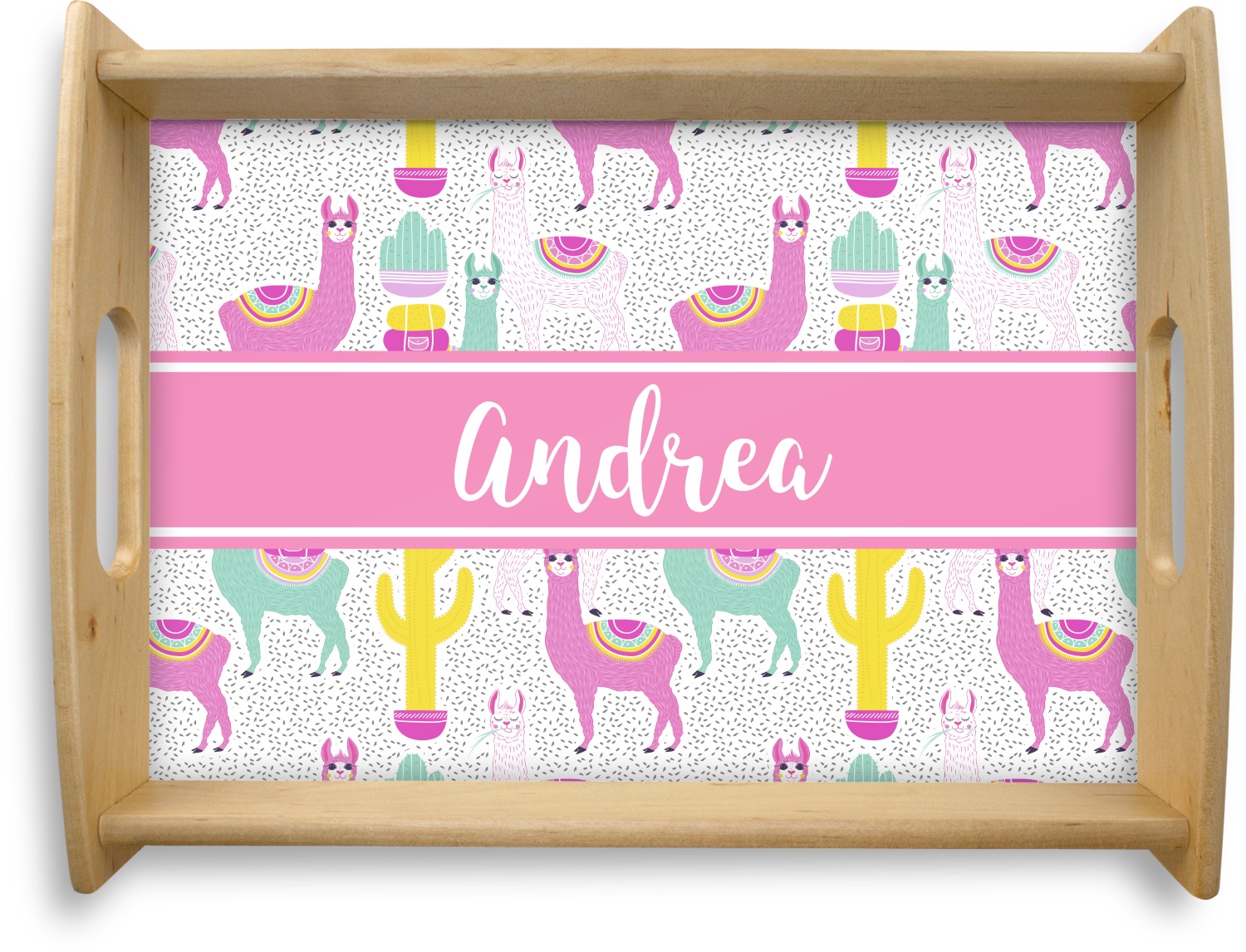 This serving tray with handles features square edges and two rounded sides, creating a very modern look. Each side is fabricated from a beautifully cut, natural wood. The bottom of the interior of the tray displays your customized design in bright, vibrant color. The tray is sold in both a black color and a natural wood look. Each variation of the wood serving tray has two sizes: Small, which is 14" x 10" x 2.25", and Large, which is 19.5" x 13.5" x 2.75".
