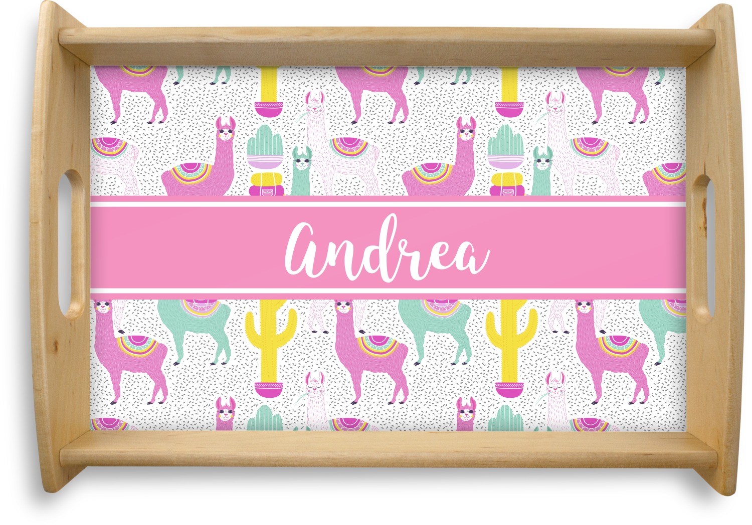 This serving tray with handles features square edges and two rounded sides, creating a very modern look. Each side is fabricated from a beautifully cut, natural wood. The bottom of the interior of the tray displays your customized design in bright, vibrant color. The tray is sold in both a black color and a natural wood look. Each variation of the wood serving tray has two sizes: Small, which is 14" x 10" x 2.25", and Large, which is 19.5" x 13.5" x 2.75".