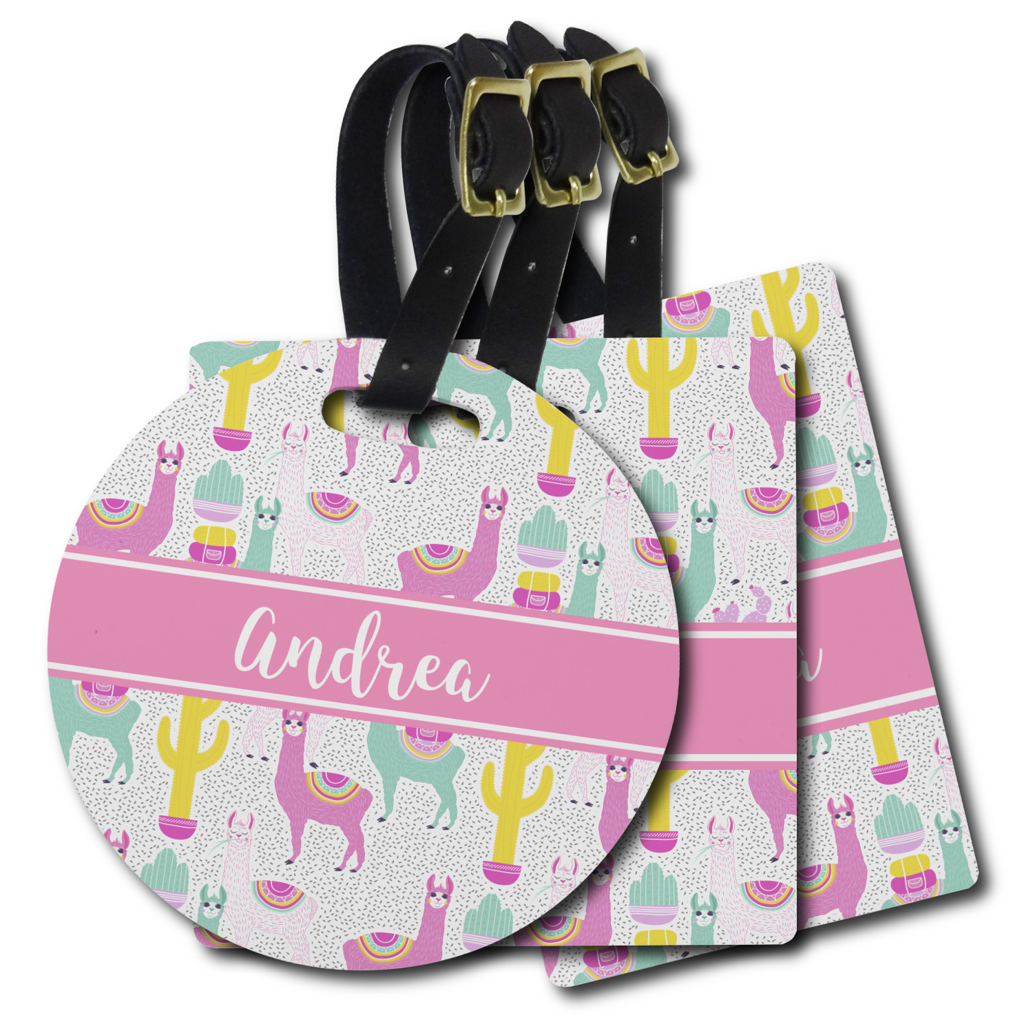 These personalized bag tags are sold in a variety of shapes, so that you may find the product that meets your vision exactly. We sell a round luggage tag, which measures at approximately 4" x 4". Our square luggage tag is about 3.5" x 3.5", while our rectangular version is 2.75" x 4 ".