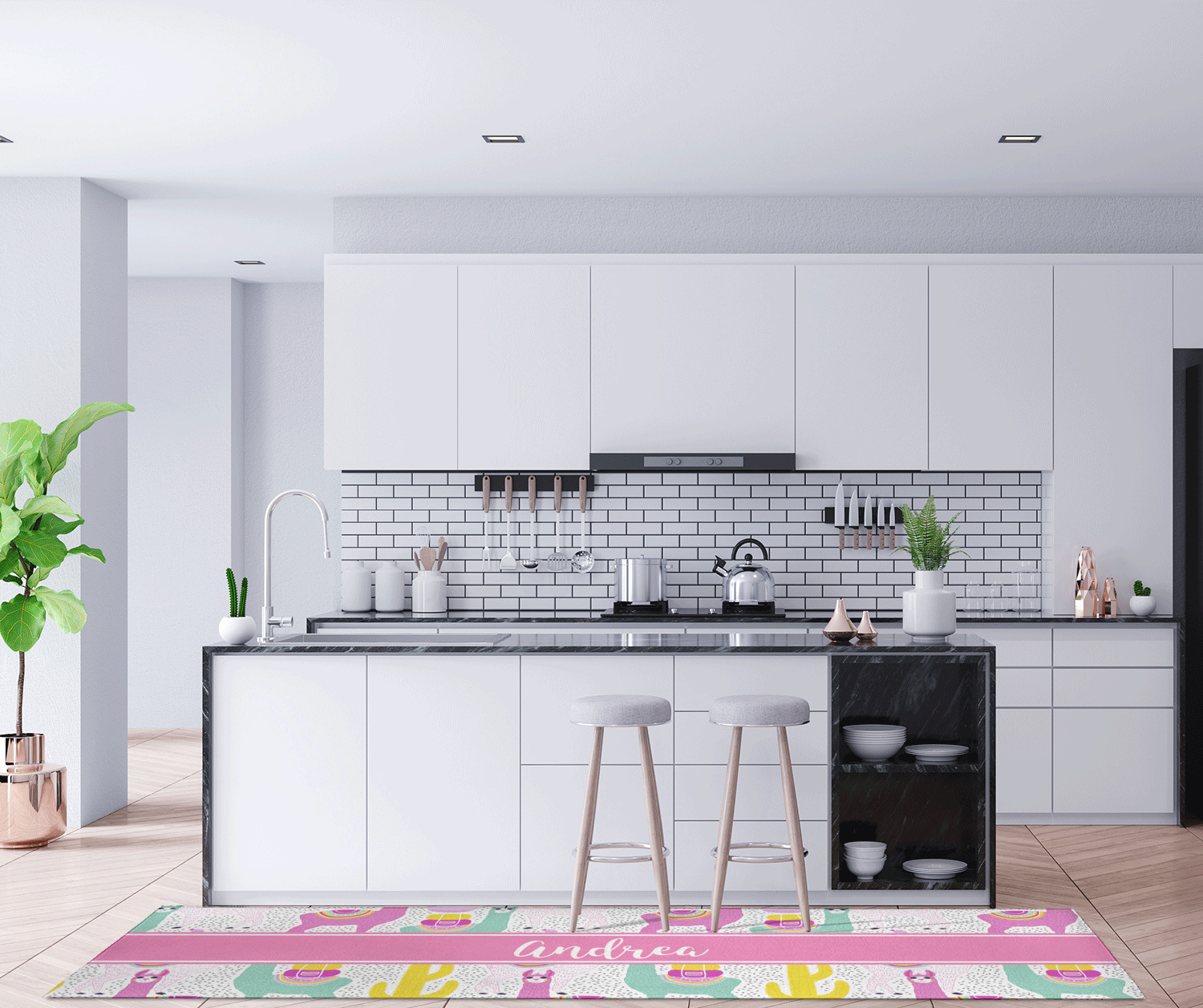 If you want to design it for your hallway - a vertical design is the perfect fit. If designing for to go in front of your kitchen island a horizontal design would suit you best! In our design system you can rotate the design either way to get the product you want.