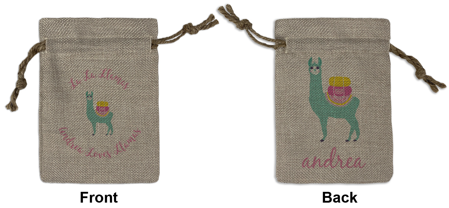 We sell our Burlap Gift Bags in 3 variant sized bags. Made with burlap polyester, each personalized bag can be secured with a twine drawstring pull. Your custom design is available to print on one side or both sides - completely up to you! The sizes of the bags measure approximately 4.5" x 6.5" for the smallest size, 6.5" x 8.0" for the medium size, and 6.5" x 13.5" for the large-sized bag.