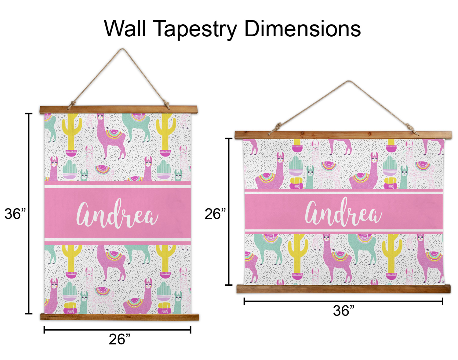 Made in two different orientations - portrait or landscape - both are 26" x 36". Your design is printed on a high quality polyester fabric with hemmed edges. The wood on the top and bottom of the tapestry is 1.25" tall and 0.25" thick and there are two pieces on top and bottom which sandwich the fabric.