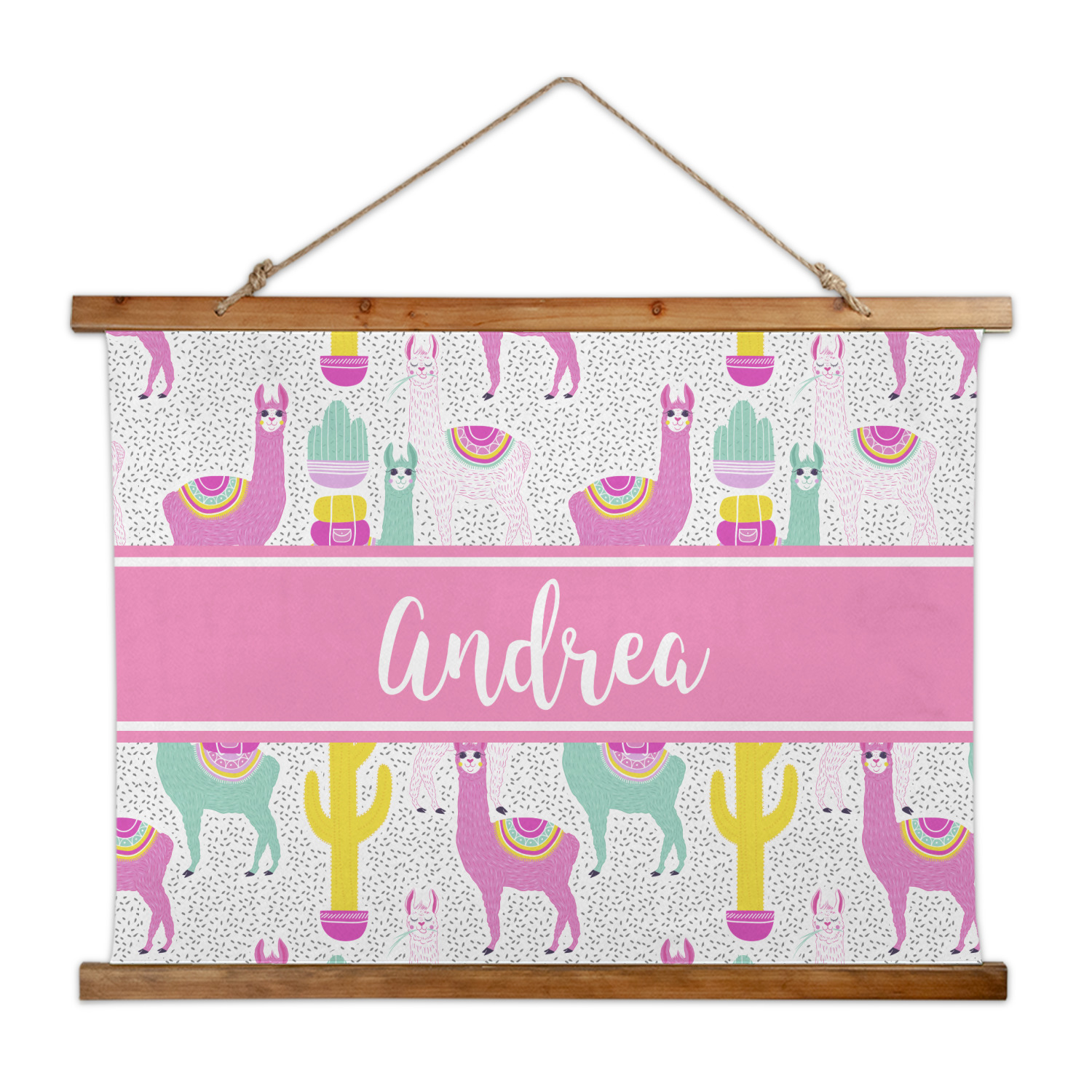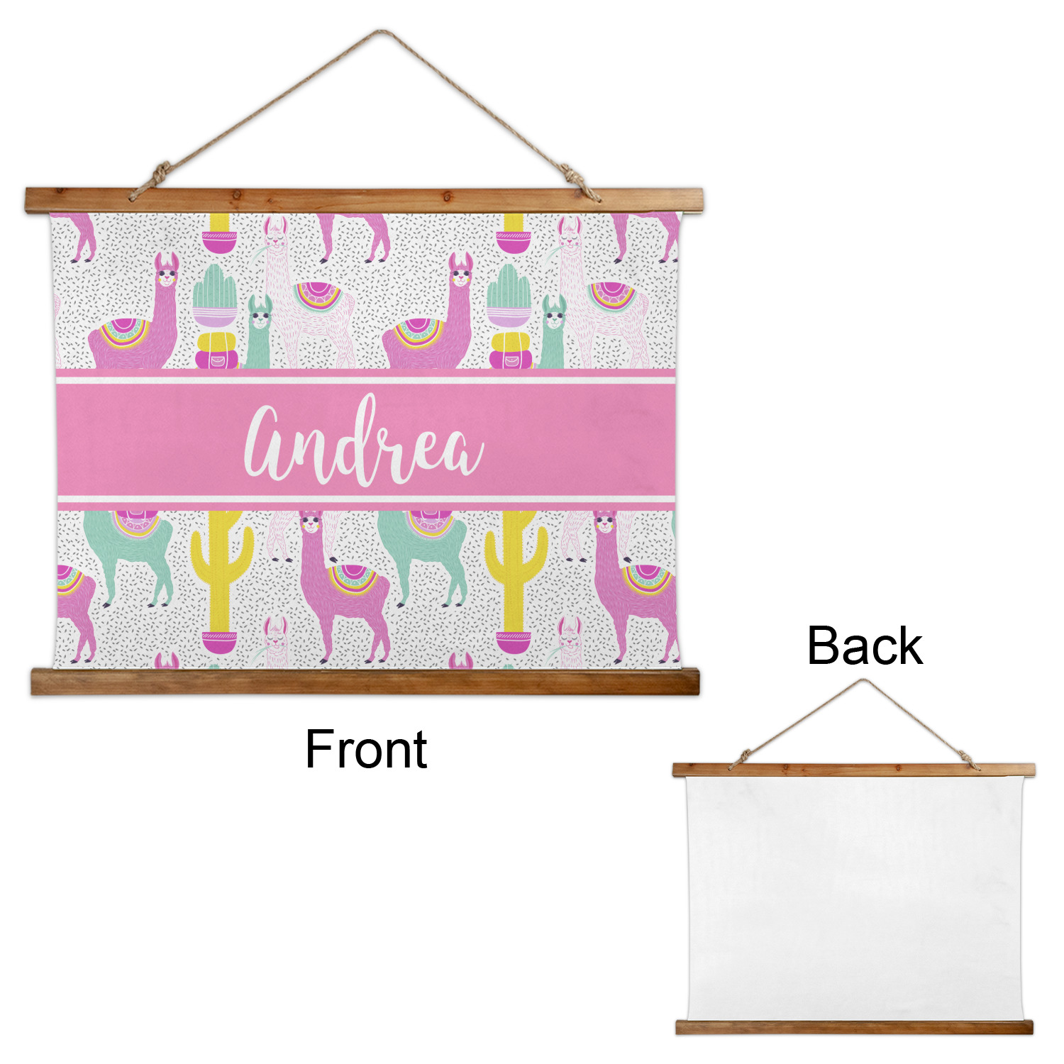 Made in two different orientations - portrait or landscape - both are 26" x 36". Your design is printed on a high quality polyester fabric with hemmed edges. The wood on the top and bottom of the tapestry is 1.25" tall and 0.25" thick and there are two pieces on top and bottom which sandwich the fabric.
