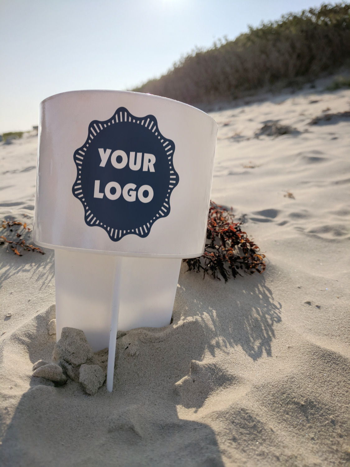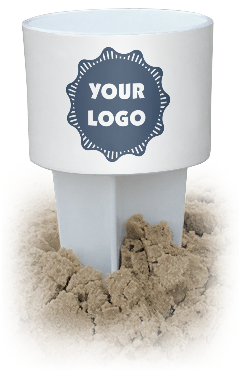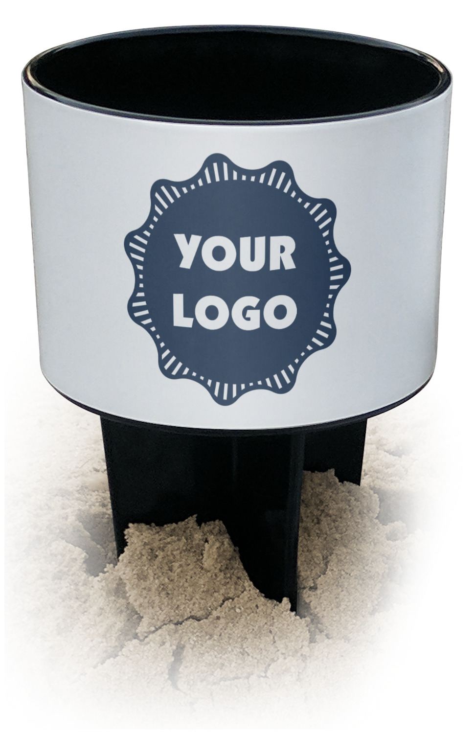 This cup holder has a large stake at its bottom that anchors it to the sand or ground below, while the cup holder rests above the stake. The entire drink holder is made of durable plastic and displays your customization around the cup holder portion. We sell these personalized beach spikers in two different colors: black and white.
