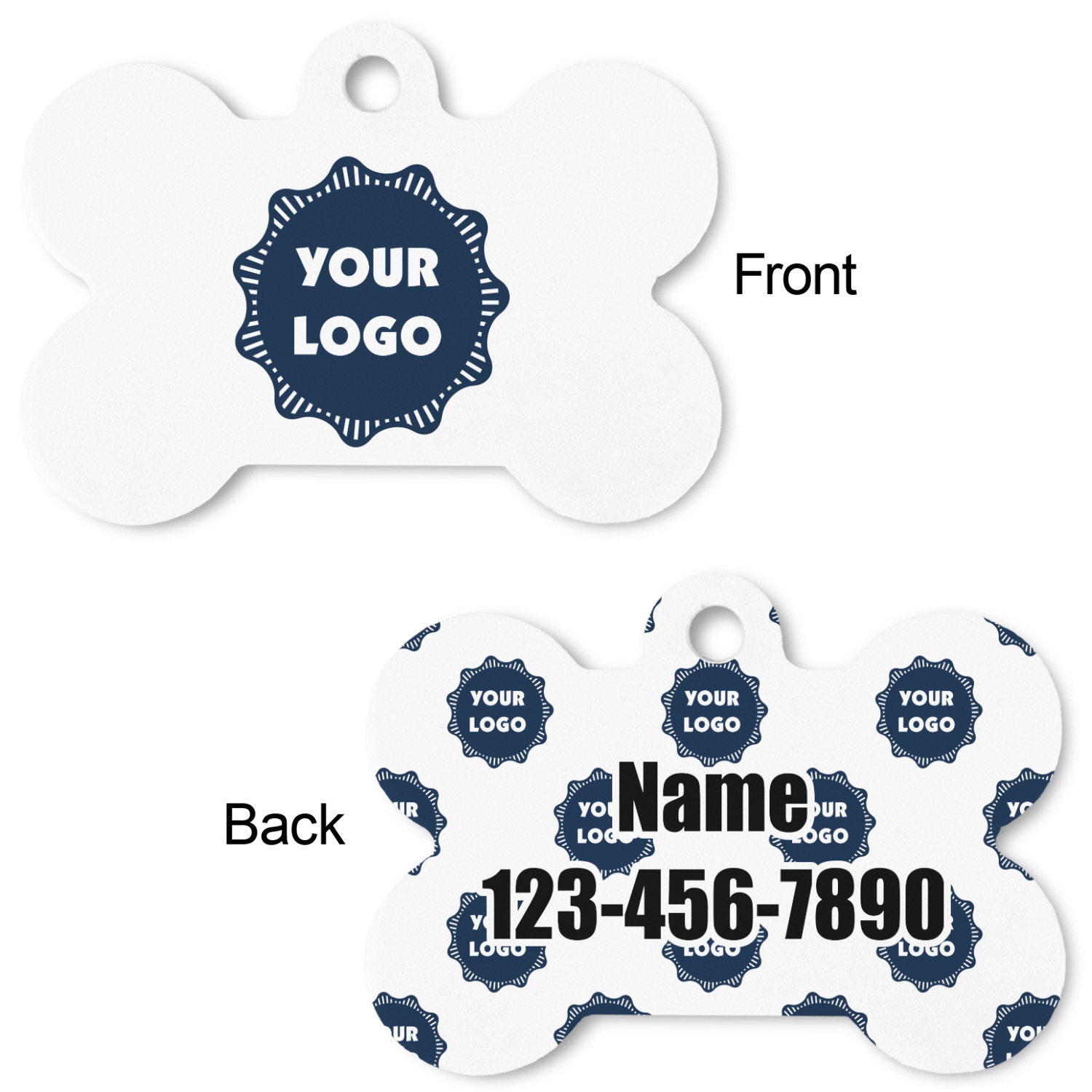 Our default design templates print your dog's personalization on the front and your contact information on the back; however everything is customizable, so you customize the patterns, the colors, the personalization, the contact information etc.