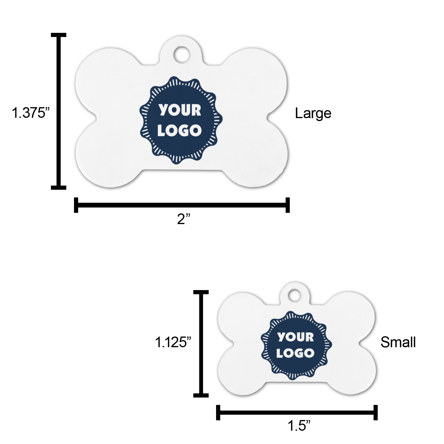 The small bone dog tag size is perfect to pair with our small dog collars, the large size pairs well with our large dog collars.