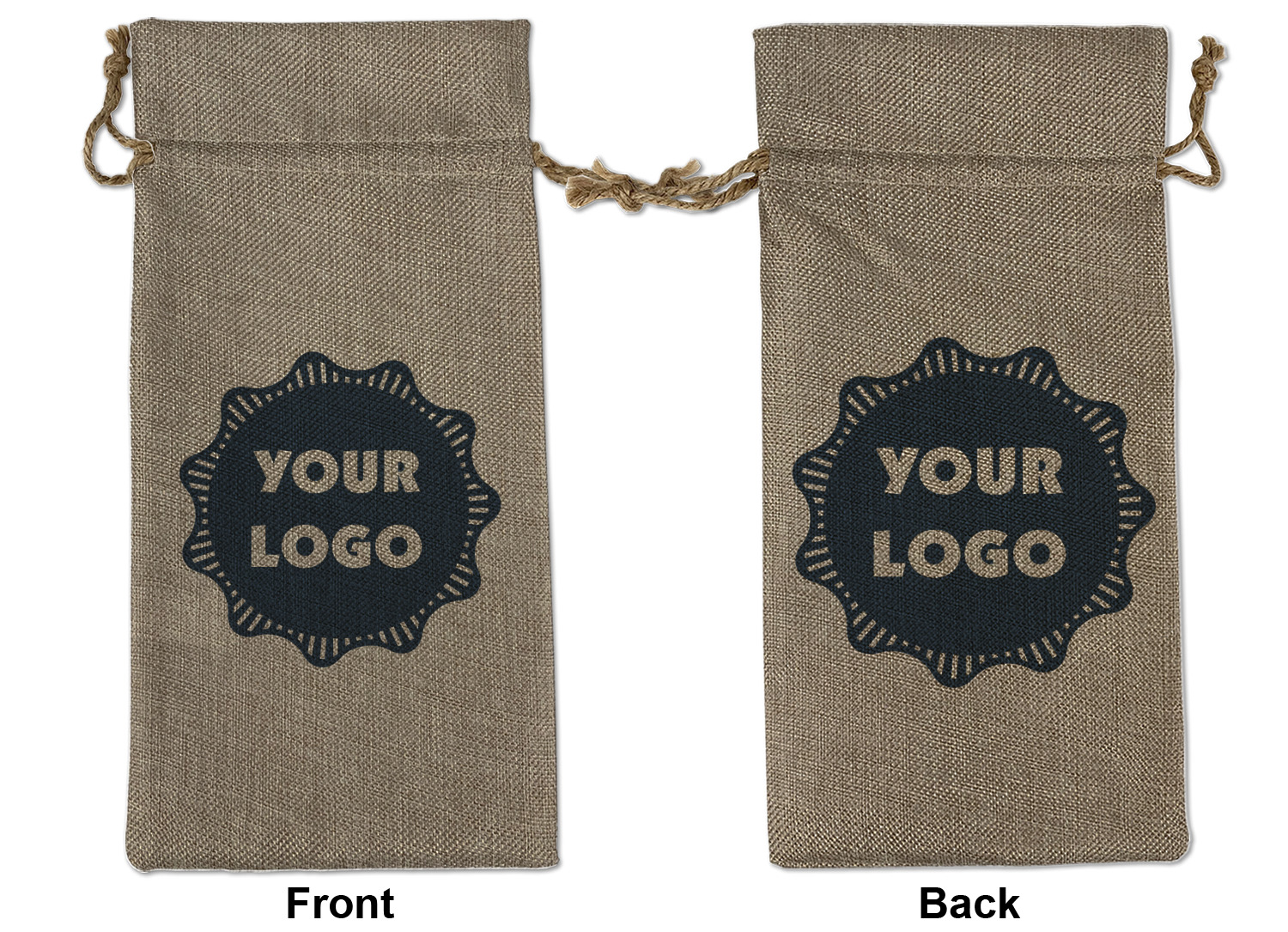 We sell our Burlap Gift Bags in 3 variant sized bags. Made with burlap polyester, each personalized bag can be secured with a twine drawstring pull. Your custom design is available to print on one side or both sides - completely up to you! The sizes of the bags measure approximately 4.5" x 6.5" for the smallest size, 6.5" x 8.0" for the medium size, and 6.5" x 13.5" for the large-sized bag.