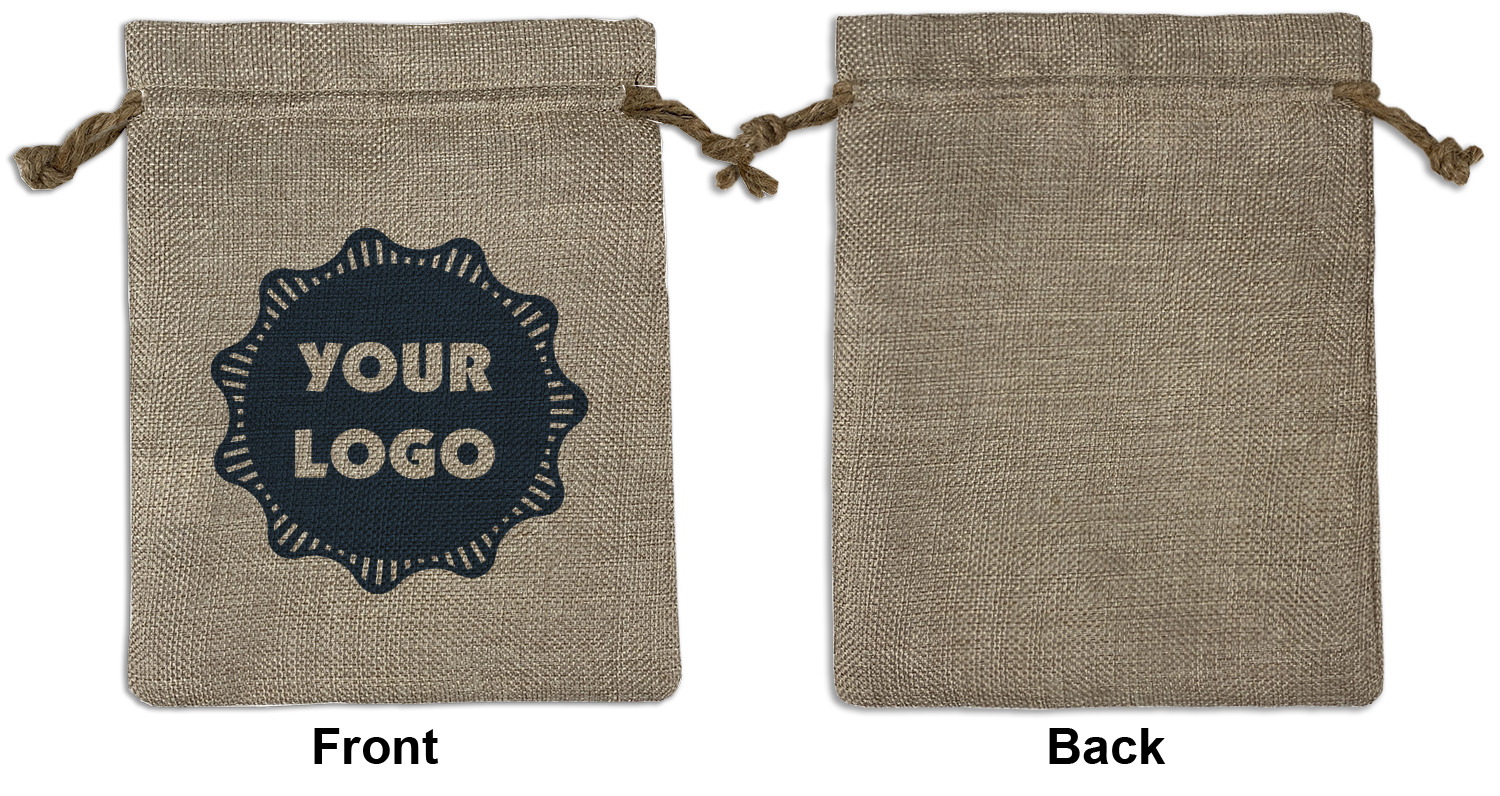 We sell our Burlap Gift Bags in 3 variant sized bags. Made with burlap polyester, each personalized bag can be secured with a twine drawstring pull. Your custom design is available to print on one side or both sides - completely up to you! The sizes of the bags measure approximately 4.5" x 6.5" for the smallest size, 6.5" x 8.0" for the medium size, and 6.5" x 13.5" for the large-sized bag.