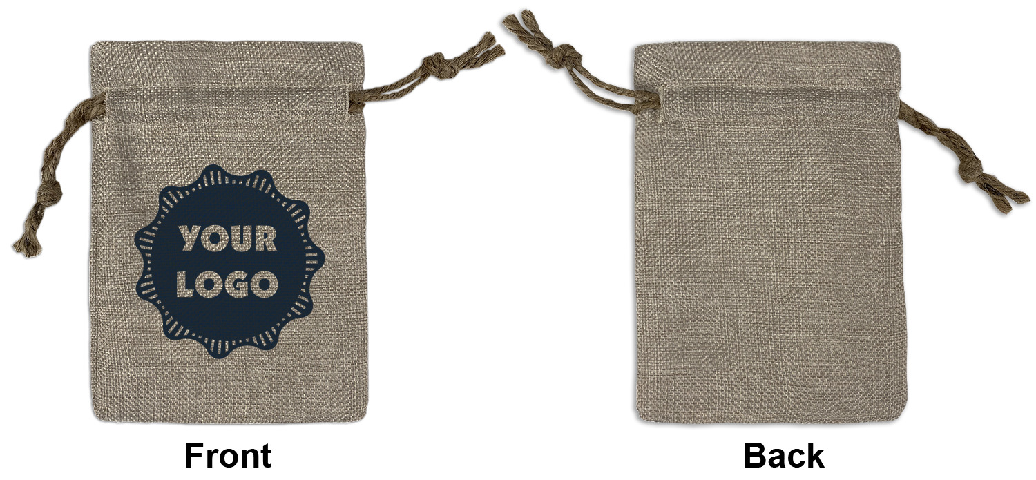 We sell our Burlap Gift Bags in 3 variant sized bags. Made with burlap polyester, each personalized bag can be secured with a twine drawstring pull. Your custom design is available to print on one side or both sides - completely up to you! The sizes of the bags measure approximately 4.5" x 6.5" for the smallest size, 6.5" x 8.0" for the medium size, and 6.5" x 13.5" for the large-sized bag.