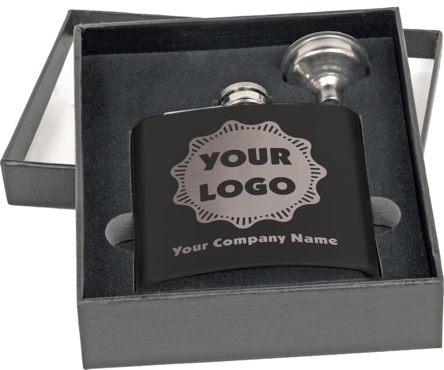 Built from a stainless steel and then covered with a black coating, this hip flask, has a very classy appearance. Similar to the standard flask, this stainless steel flask has the traditional curved shape for a snug fit in your palm. This flask set also includes a traditional screw and flip lid and liquid funnel in a gift box. At 4 by 4.5 inches, this flask can hold up to 6 ounces. Your personalized design is laser-engraved across the front of this flask.