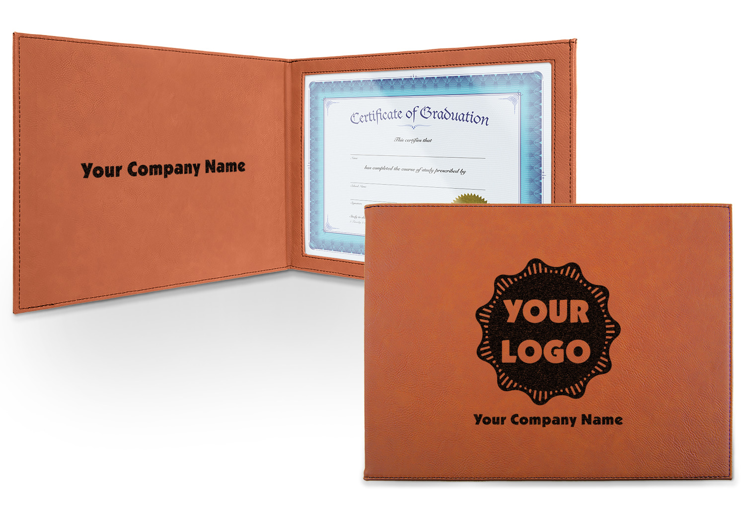 This cognac-colored, leatherette certificate jacket is the ideal way to display or store your hard-earned certificate. When closed, the custom certificate holder measures at 12 by 9 inches. The interior of the certificate cover includes a clear, vinyl window to encase your diploma. The window measures at around 10.5 by 7.5 inches and can accommodate a diploma that measures at up to 8.5 by 11 inches. You can either choose to have your customization laser engraved on the front and interior, or solely the front.