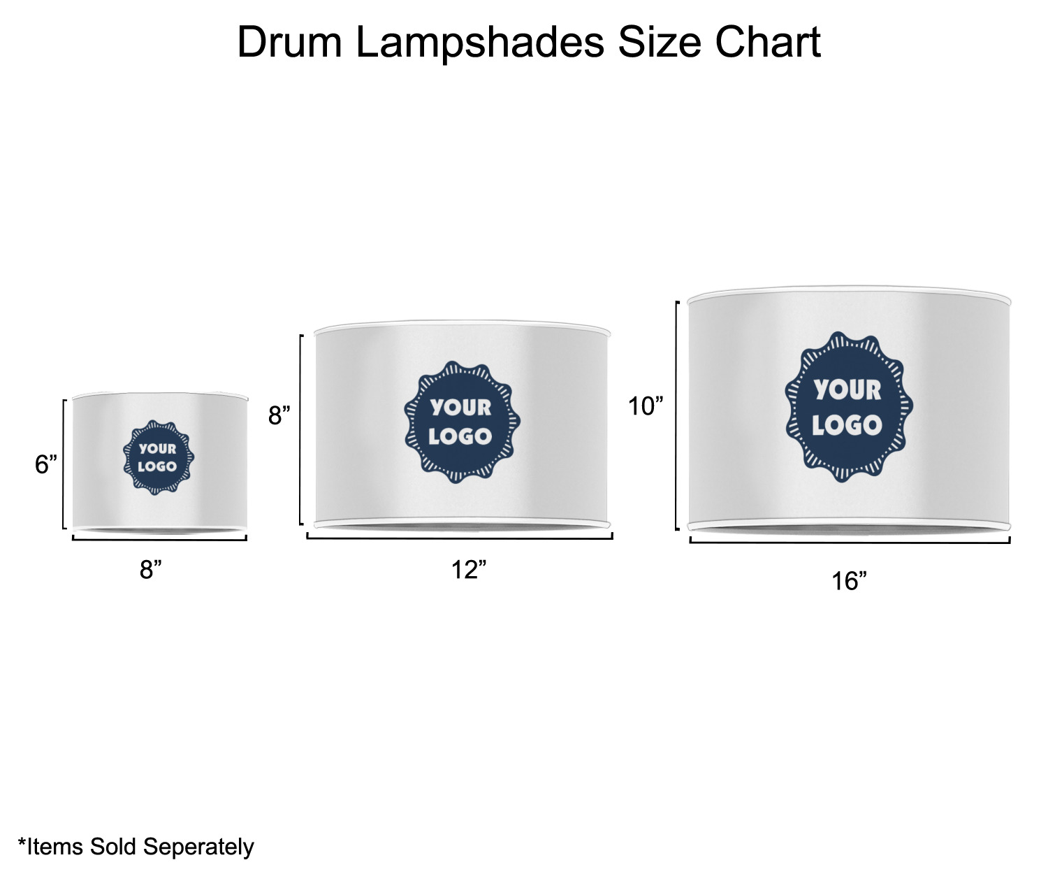 Our customized lamp shades also come in 3 different sizes: 8", 12" and 16", measuring at 8" in diameter by 6" tall, 12" in diameter by 8" tall, and 16" in diameter by 10" tall, respectively.