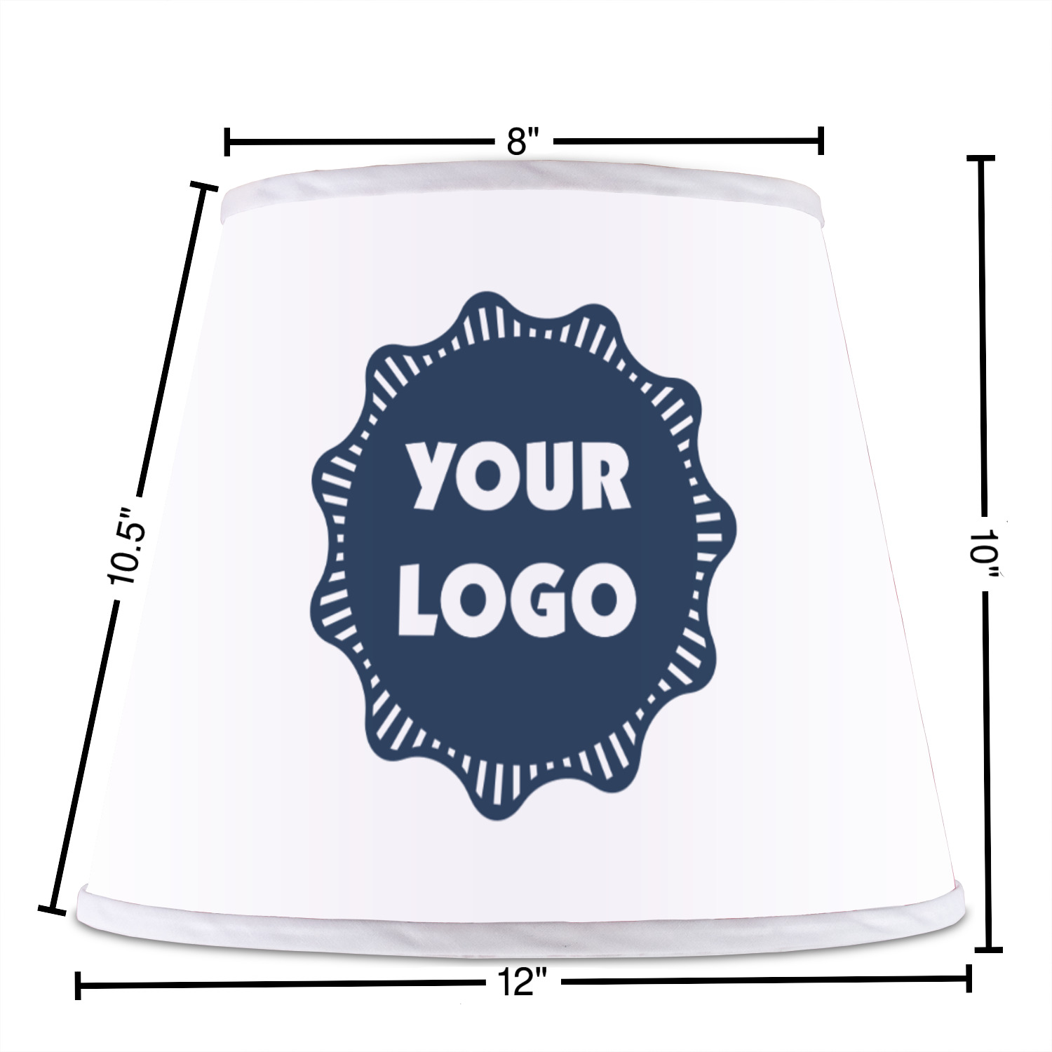 The base of this lampshade is 12 inches in diameter, and the top spans 8 inches in diameter. The total height of the lampshade is 10 inches. The angled nature of this custom lampshade concentrates the light, making it ideal for smaller spaces. This lampshade is made of matte, polyfilm, and displays your customization in its middle. The top and bottom of this colorful lamp shade are lined with a white fabric ribbon (which can be replaced with black inside the design studio) which frames your design and creates a sophisticated finish. As an UNO fitter lampshade, this unique lamp shade will fit a variety of bases.