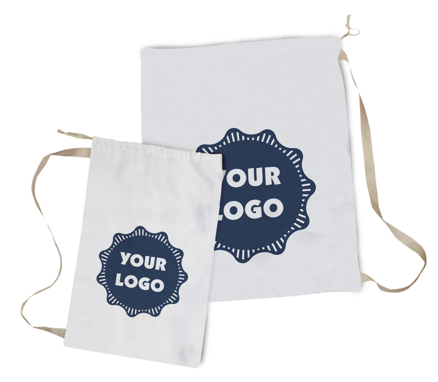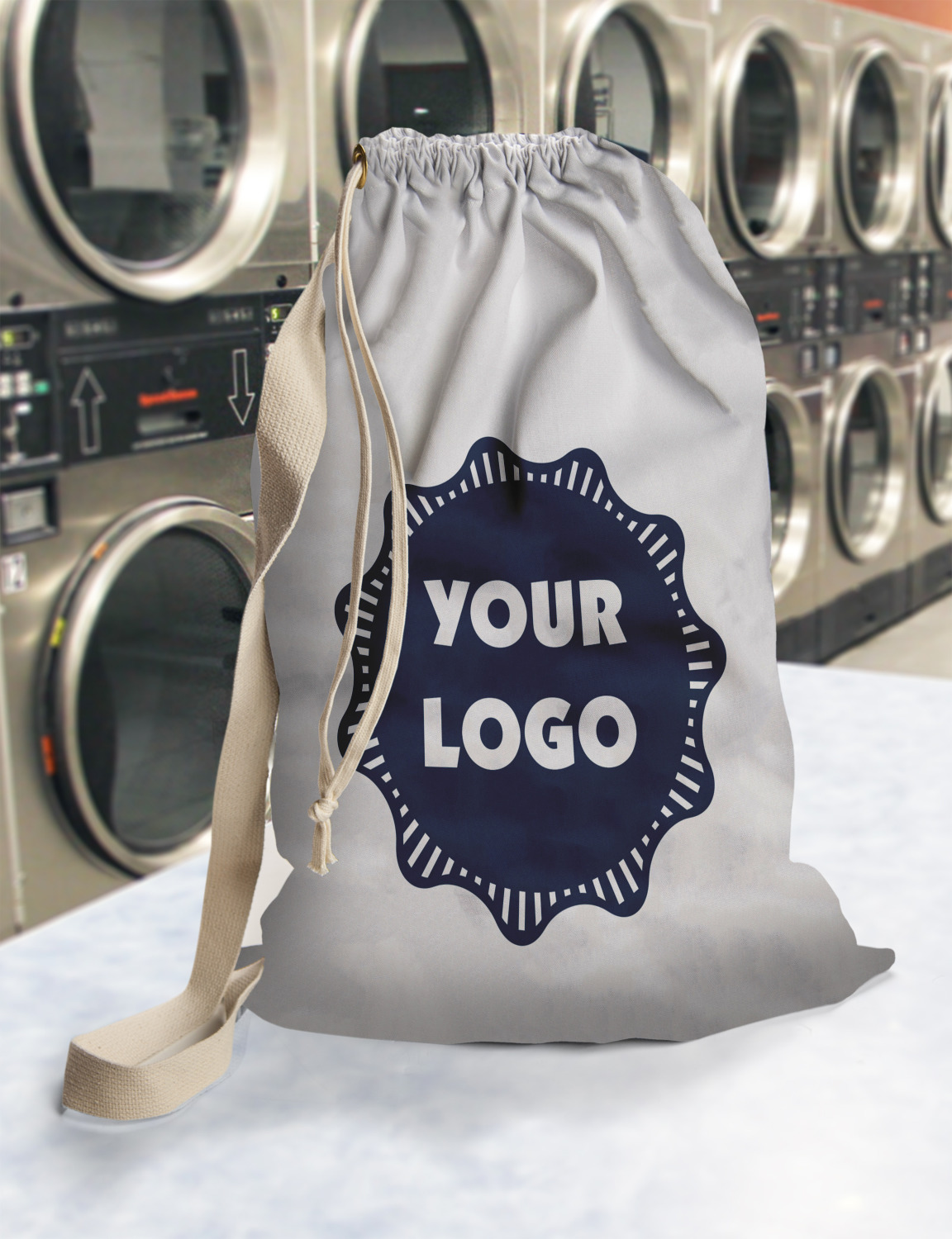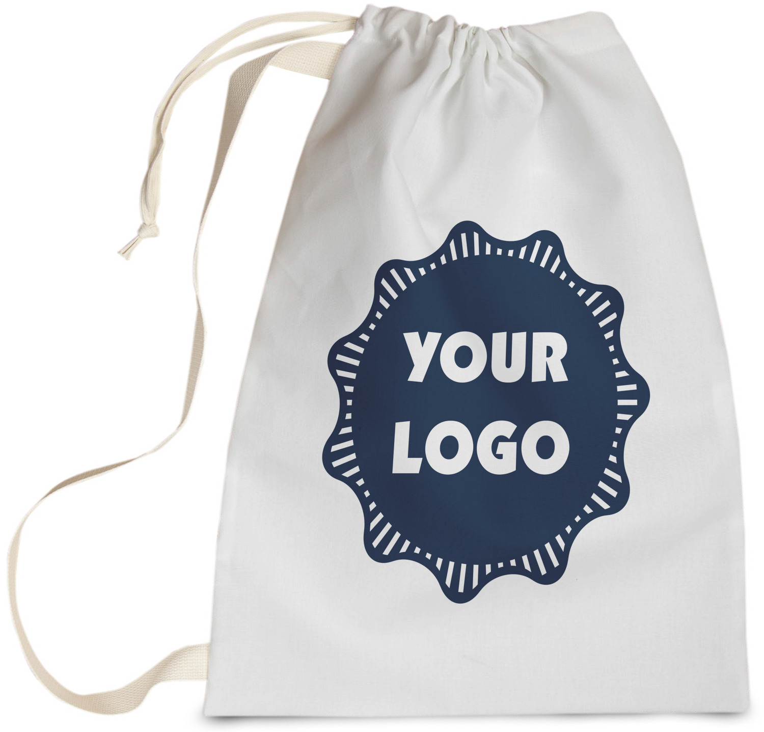 Carry your laundry in style with these customized laundry bags. Available in two sizes, featuring a natural colored woven strap and a cinch cord, these bags hold a lot of clothes or anything else you want to fit in them.