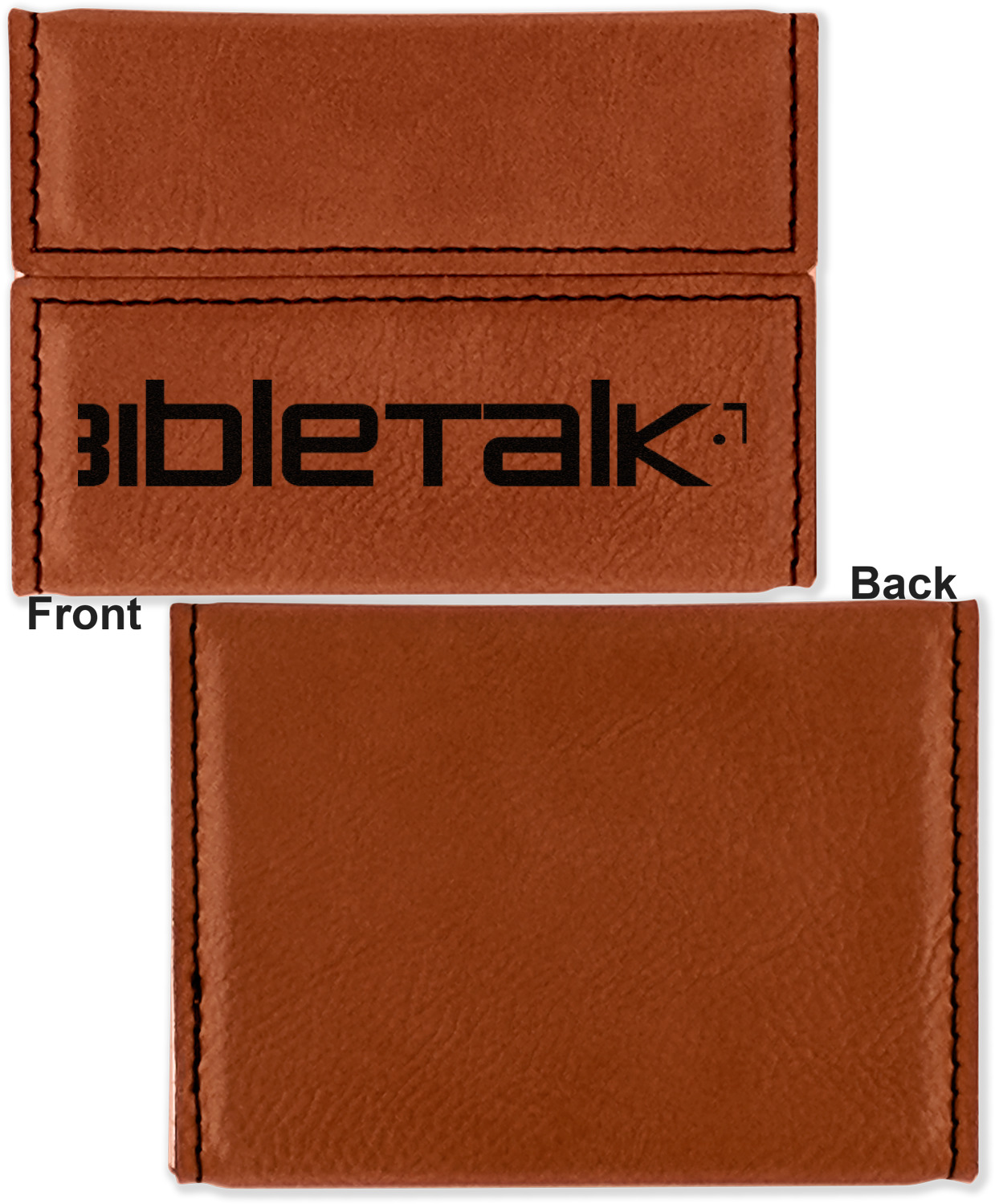 Your personalized design is laser engraved onto either the front, or the front and back of the card holder, depending on the model you purchase. Once engraved, the design will appear a darkened black against the cognac color of the leatherette.