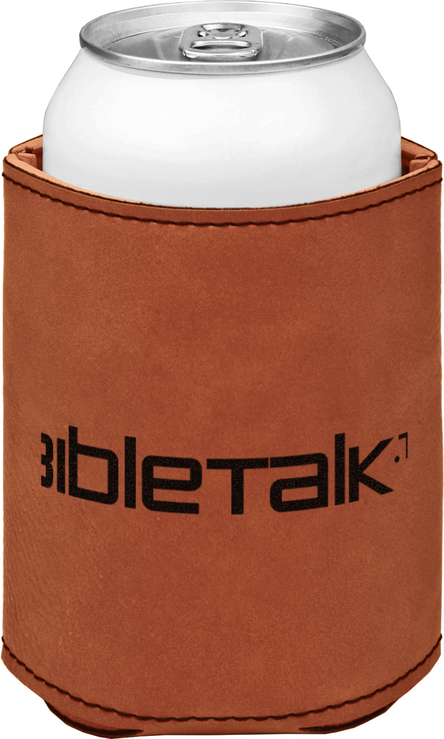 This can sleeve is made from a cognac-brown leatherette and stitched with a sturdy, black thread. A slim padding lines the inside of your can sleeve to allow for a better fit once your drink is inserted. The sleeve itself measures at 4 by 4.5 inches, allowing this custom can sleeve to accommodate most canned drinks. Your personalized design can be engraved on the front and back, or solely the front. When laser-engraved, your design appears as a black coloration which contrasts the leatherette nicely.