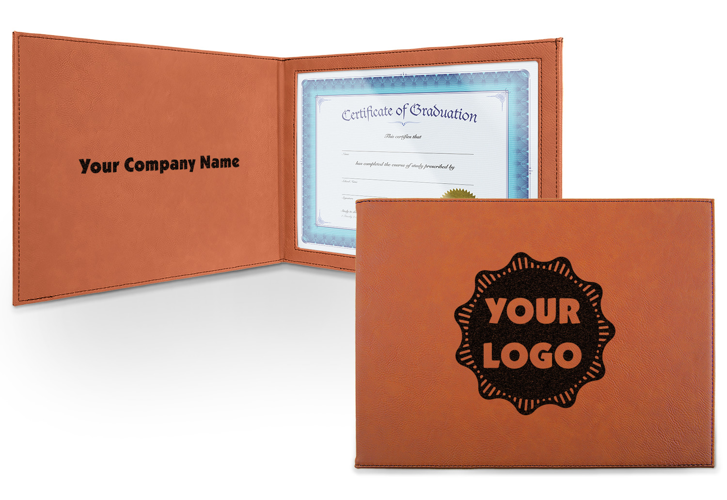 This cognac-colored, leatherette certificate jacket is the ideal way to display or store your hard-earned certificate. When closed, the custom certificate holder measures at 12 by 9 inches. The interior of the certificate cover includes a clear, vinyl window to encase your diploma. The window measures at around 10.5 by 7.5 inches and can accommodate a diploma that measures at up to 8.5 by 11 inches. You can either choose to have your customization laser engraved on the front and interior, or solely the front.