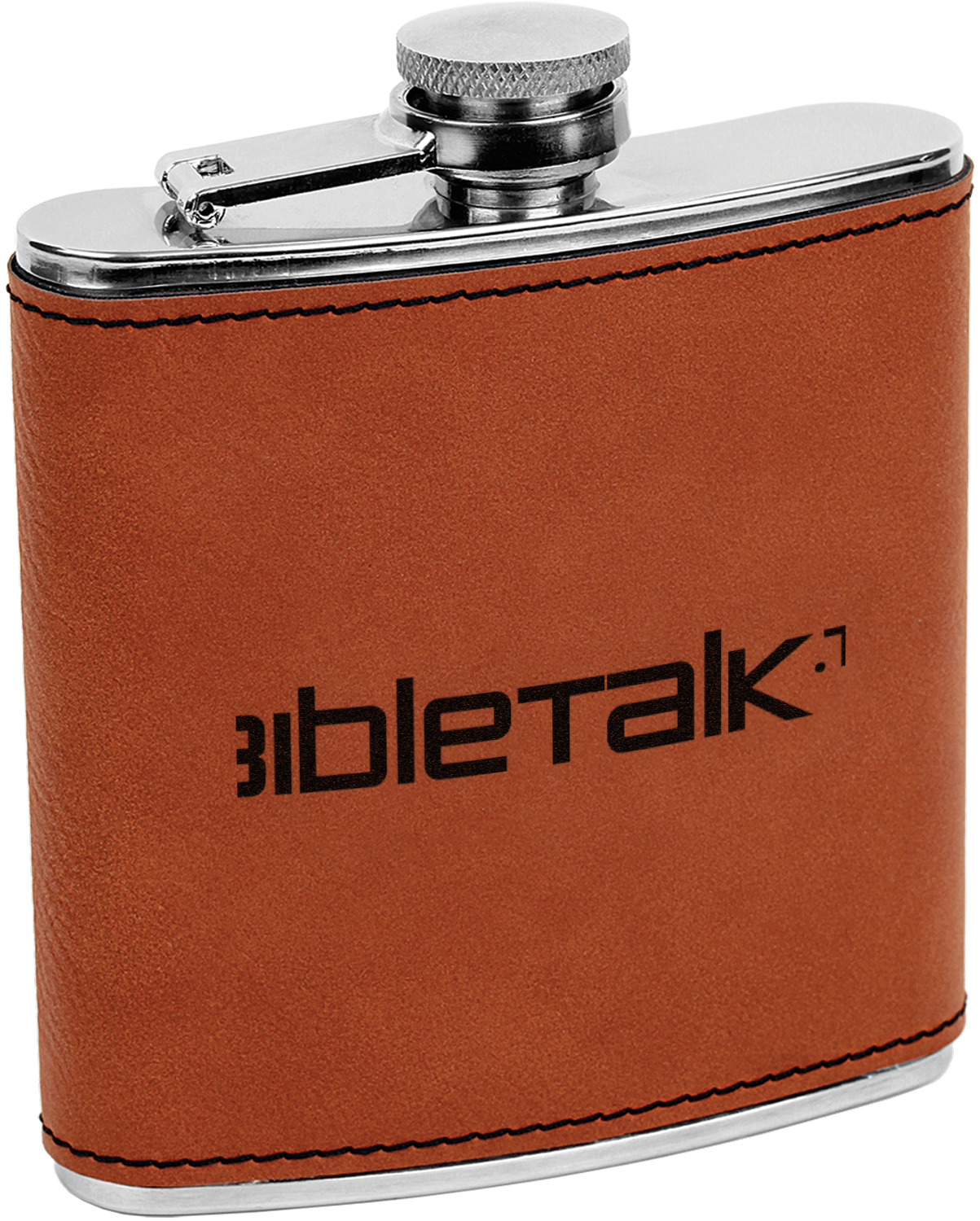 This custom flask is built from stainless steel, can hold 6 ounces, and is wrapped in a cognac-brown leatherette sleeve. The leatherette supplies a good grip on the liquor flask, while the slight curvature of the flask itself allows for a snug fit in your hand. Fine, black stitching lines the edges of the leatherette, adding to the durability of the material. This personalized flask features the traditional, screw and flip lid at its top, which prevents any unwanted spillage. Your customized design is precisely laser-engraved into the leatherette, leaving an elegant, dark-brown, almost black coloration.