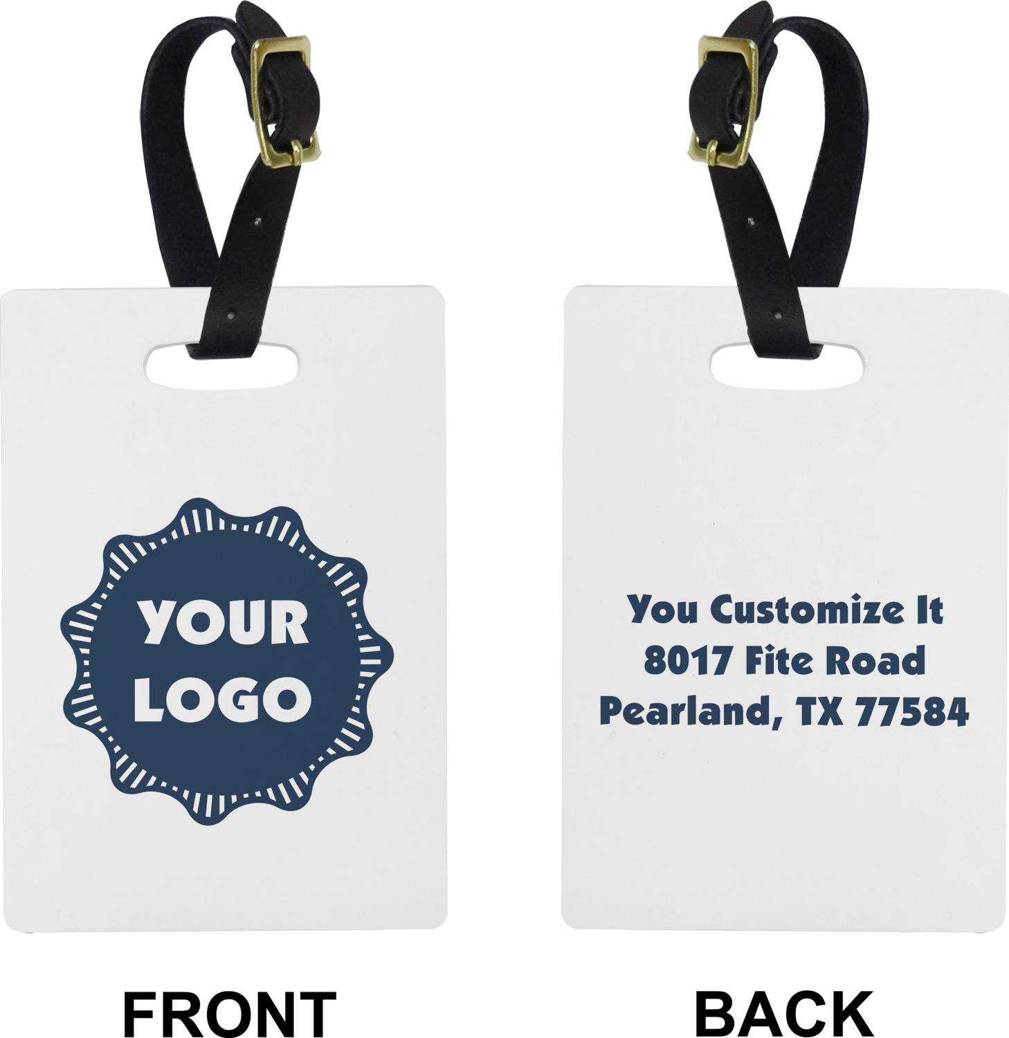 These personalized bag tags are sold in a variety of shapes, so that you may find the product that meets your vision exactly. We sell a round luggage tag, which measures at approximately 4" x 4". Our square luggage tag is about 3.5" x 3.5", while our rectangular version is 2.75" x 4 ".