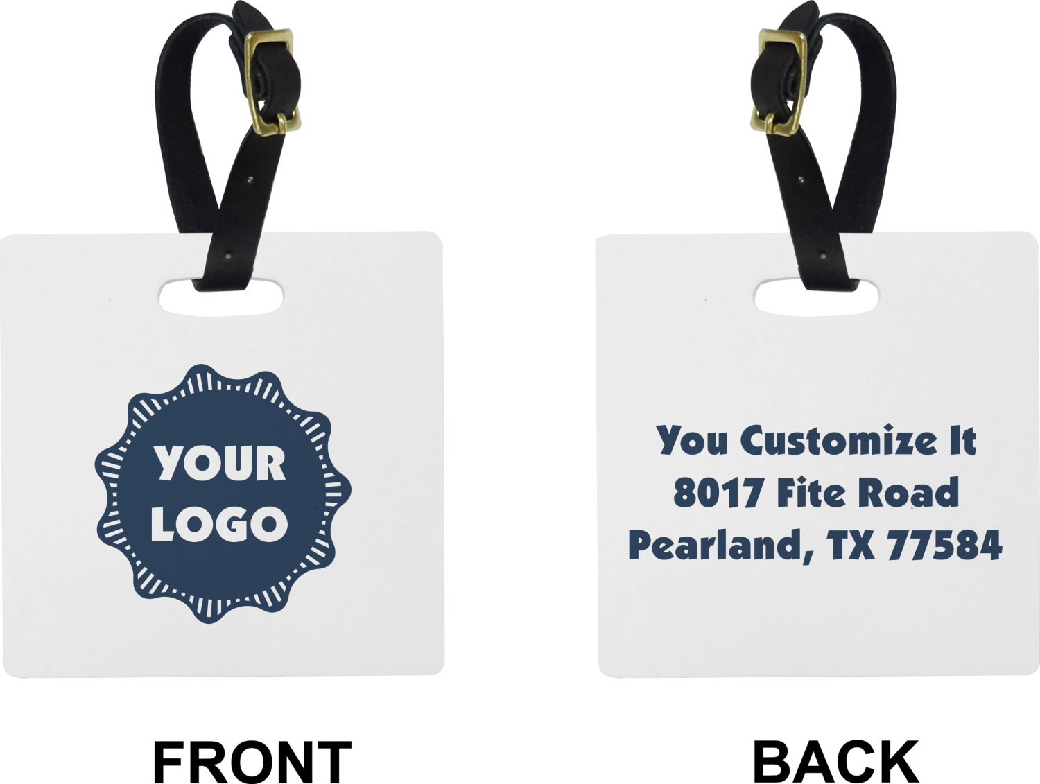 These personalized bag tags are sold in a variety of shapes, so that you may find the product that meets your vision exactly. We sell a round luggage tag, which measures at approximately 4" x 4". Our square luggage tag is about 3.5" x 3.5", while our rectangular version is 2.75" x 4 ".