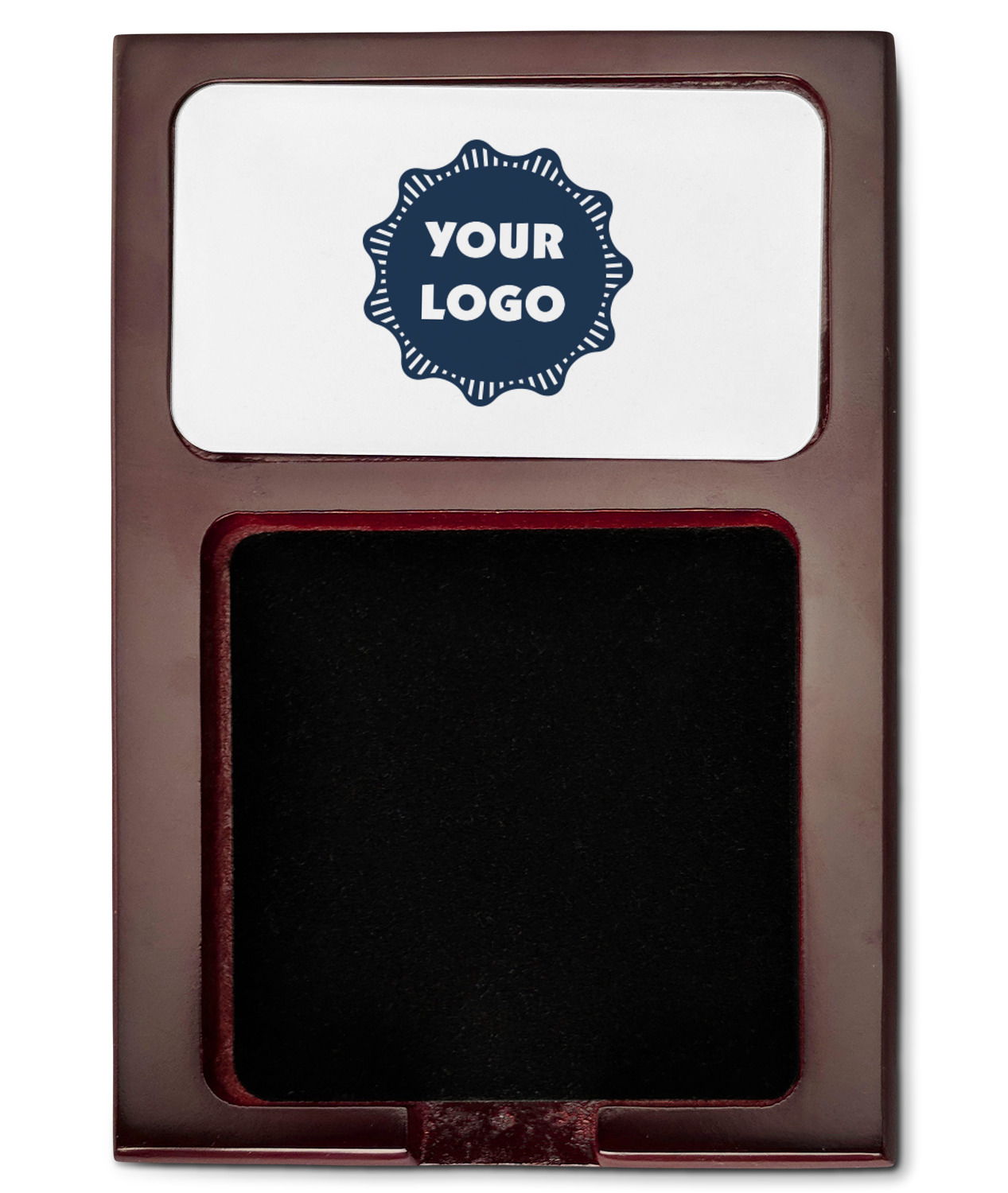 Crafted from a fine mahogany, this post it note holder is in the shade of a dark, cherry color. The dispenser itself is about 4.25 by 6.25 by 0.75 inches. You can place your 3 by 3 inch sticky notes in the indentation below the nameplate. We print your customization onto the nameplate that rests above the velvety indentation.