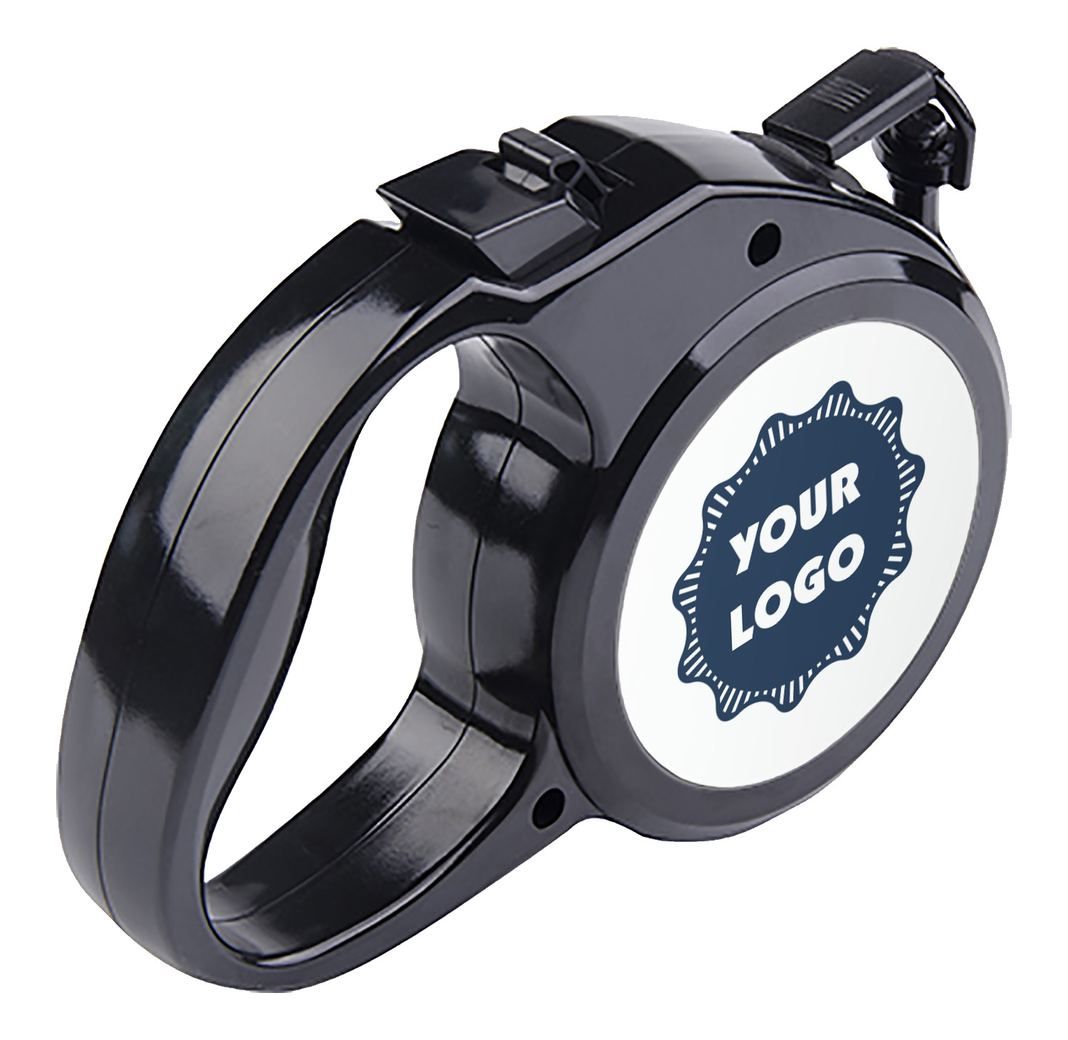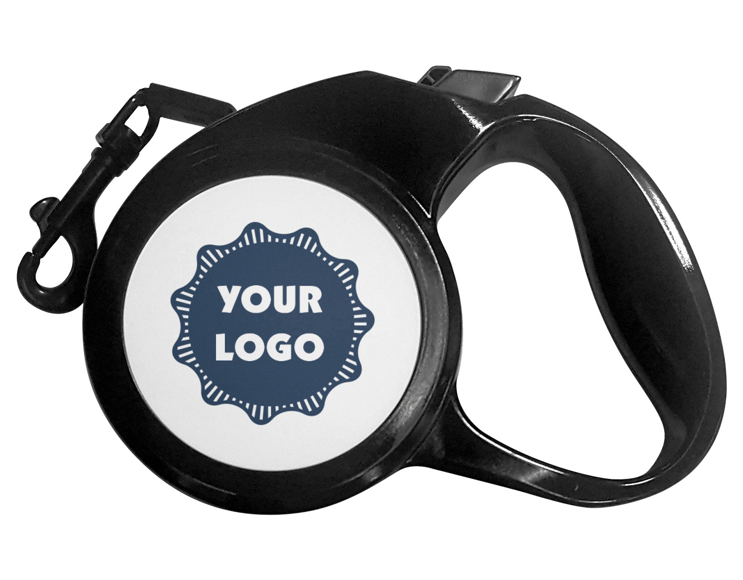 The leash's plastic handle is accommodating of your grip and displays your customization on both sides. The dog leash also features the traditional bolt snap clip, for easy fastening to your dog's collar. The leash and leash handle themselves are both black in color.
