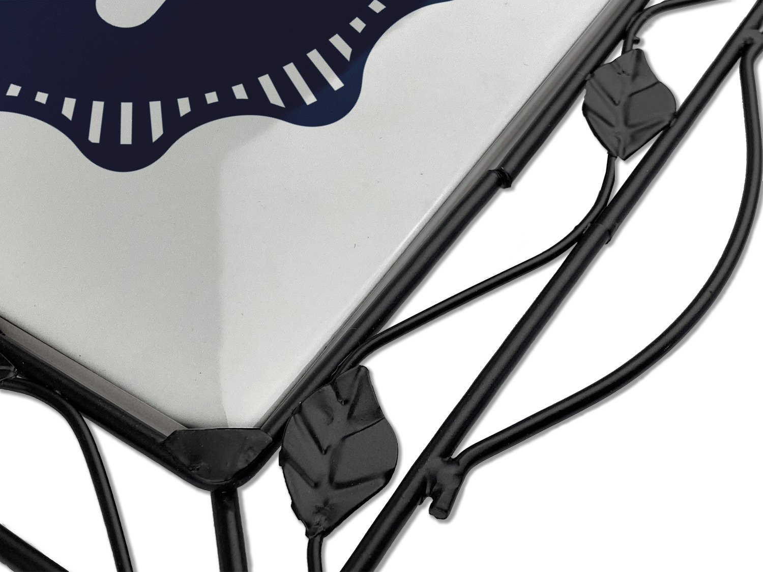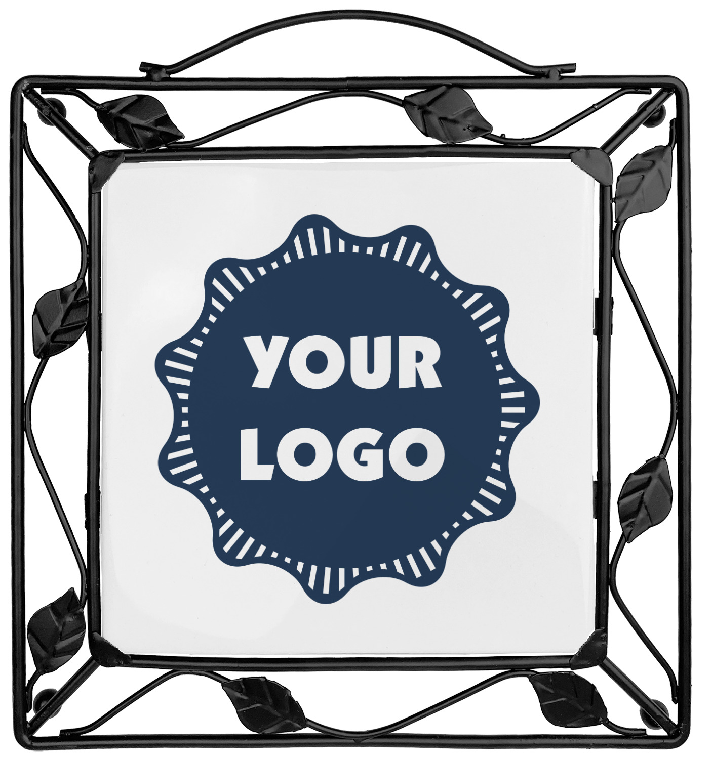 Our square trivets are made from a durable, wrought iron. This model features 4 small half circles, one on each corner, and a larger ring of iron that circles the central, customized tile. Each of the 4 corners has a round foot on its bottom for stability. This trivet is 8.75 by 8.75 inches, but the central tile measures at 6 inches on both sides.